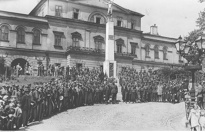 lipiec 1935 , Wycieczka instruktorów związku Młodzieży Powstańczej przebywających na obozie w Nierodziniu do Cieszyna. Fotografia grupowa uczestników wycieczki pod pomnikiem Poległych Legionistów.Skomentuj zdjęcie
