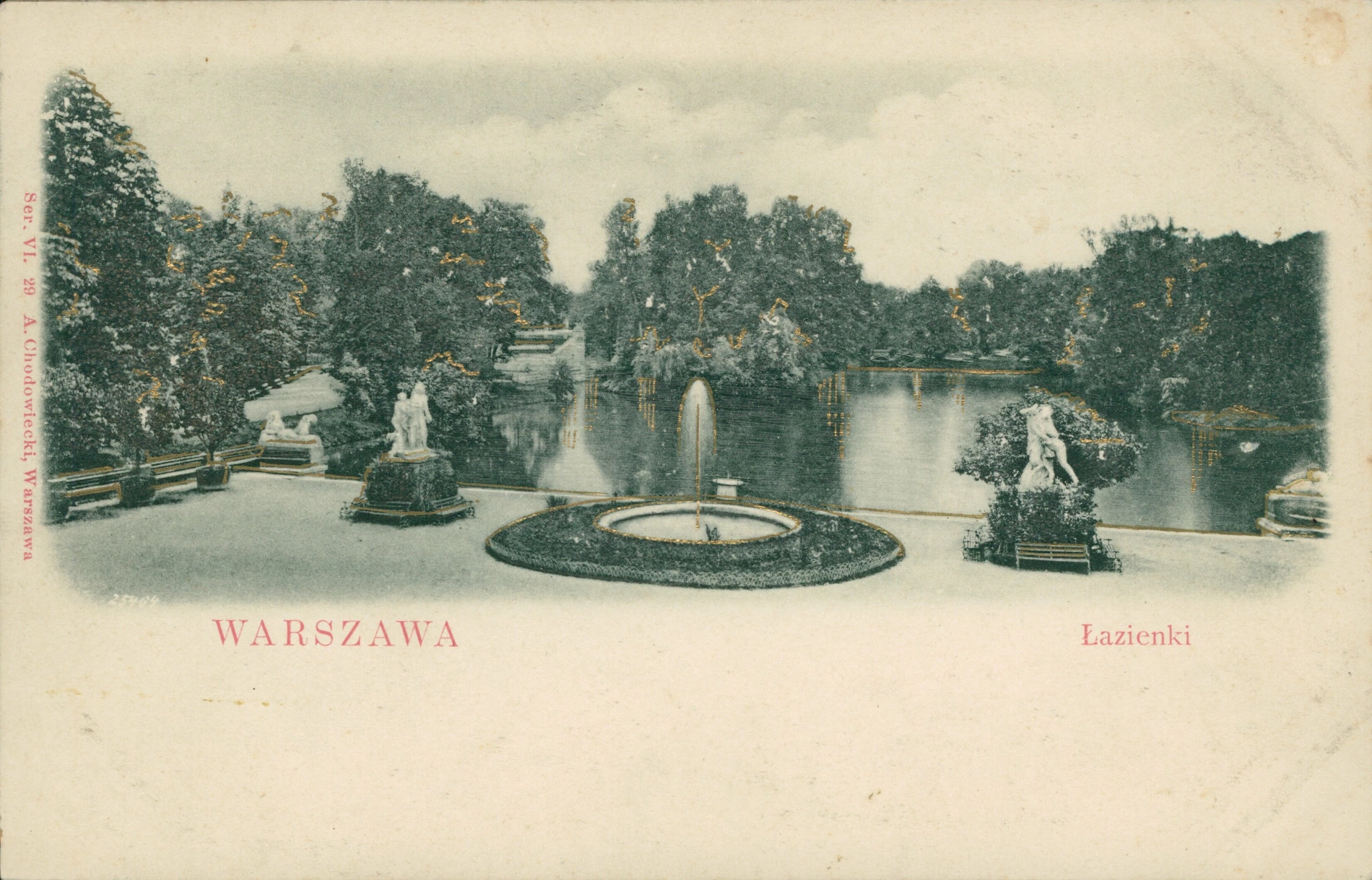 Lata 1910-1912 , Fontanna w Łazienkach. Zdjęcie cięte nieco szerzej, wzbogacone o złote podkreślenia konturów.