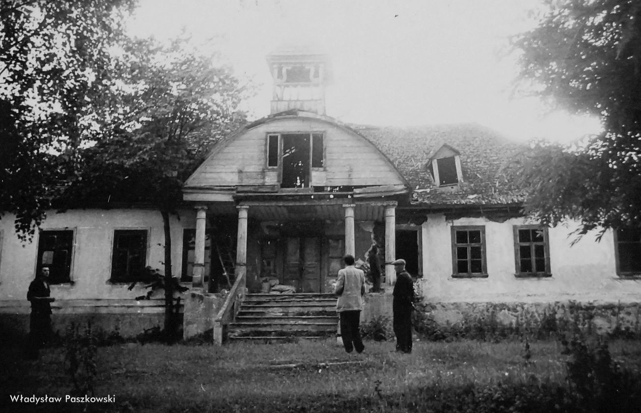 1947 , Widok na fasadę frontową (wschodnią) z usytuowanym centralnie gankiem z czterema słupami podtrzymującymi półowalny szczyt zwieńczony wieżyczkąSkomentuj zdjęcie |