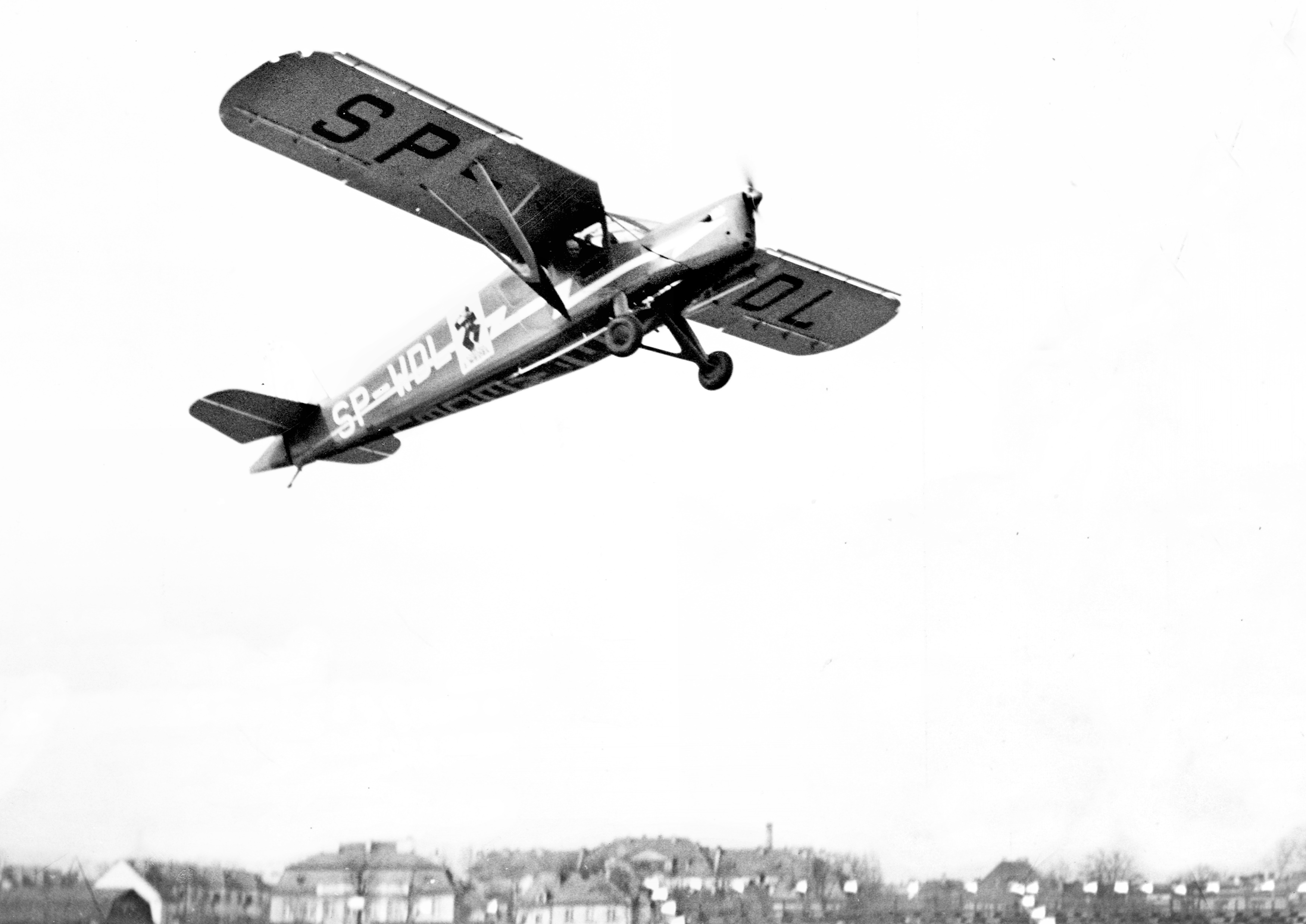 Lata 1937-1938 , Samolot typu RWD-13, który w latach 30. XX w., służył do transportowania wyrobów Wedla nad morze, z umieszczonym logo firmy, nad lotniskiem Okęcie.