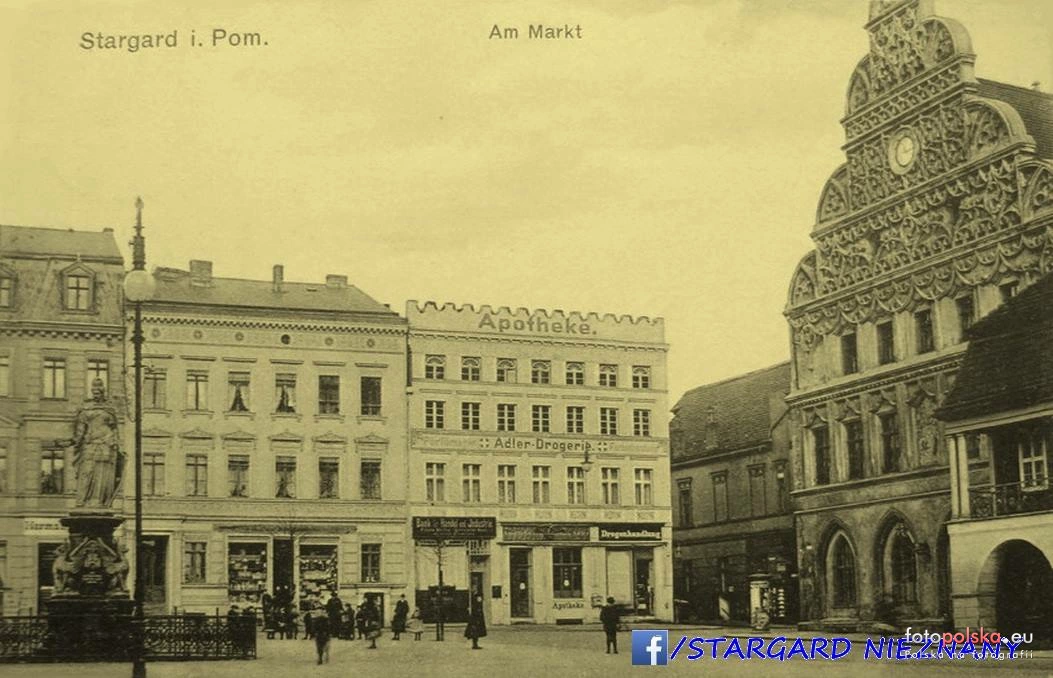 2 pobrania 508 odsłon 0 średnia ocen Poprzednie i następne zdjęcia Wojciech Szuba Obiekty widoczne na zdjęciu Rynek Staromiejski więcej zdjęć (508) Dawniej: Markt Rynek Staromiejski w Stargardzie (d. Markt) - jeden z głównych placów miasta, stanowi centrum życia lokalnego od połowy XIII wieku. Rynek jest obecnie największym skupiskiem cennych zabytków w mieście, znajdują się tu: Kolegiata Mariacka, Ratusz miejski, Odwach oraz barokowe kamieniczki. Po II wojnie światowej Rynek (podobnie jak duża część miasta) utracił swój pierwotny wygląd. Najpiękniejsze kamienice np. Loewen Aphoteke z 1487 czy kamienica wzorowana na fasadzie ratusza zostały zastąpione budynkami z wielkiej płyty. W 1874 roku w centralnej części placu ustawiono pomnik Germanii - ku czci żołnierzy poległych w wojnie francusko-pruskiej. Monument został rozebrany jeszcze przed wybuchem wojny przez narodowych socjalistów. Od średniowiecza do zakończenia II wojny światowej plac pełnił funkcje targowe wraz z okolicznymi Rynkami: Solnym, Mięsnym, Drzewnym stanowił miejskie centrum handlowe. Na początku XX wieku ulokowane były w Rynku agencja ubezpieczeniowa, bank, hotel, zakład kolonialny, restauracja, apteka, dom mody i in. W planach rewitalizacji miasta do końca br. przewiduje się zamknięcia dla ruchu kołowego Rynku Staromiejskiego wraz z ulicami przyległymi. Przebudowana ma być płyta placu, zbudowane podziemne szalety, fontanna, i pozostała mała architektura. Z Rynku wychodzi 5 ulic: Grodzka ( w dwóch kierunkach d. Poststr. i Radestr.), Mieszka I (d. Pyritzerstr.), Mariacka (d. An der Marienkirche) oraz Kramarska (d. Krammerstr.). Za Po przejęciu władzy przez NSDAP w 1933 r. policja stargardzka została podzielona na ochronę, ochronę, policję drogową i porządkową, podzielona na dwa komisariaty policji w ratuszu i na dworcu kolejowym (Barnimstraße) z policją liczącą 32 funkcjonariuszy, z dobrze znane czako (cylindryczne nakrycie głowy przypominające hełm noszone przez policję po 1918 r.) z kokardą. Ponadto w domu przy Markt 14 na parterze znajdował się wydział kryminalny z 7 funkcjonariuszami, w ratuszu wydział handlowy z kontrolą żywności i cen oraz policja targowa z 4 doświadczonymi policjantami. Policja administracyjna składała się z 2 inspektorów miejskich. W 1937 r. szefem starogardzkiej komendy policji, której obszar obejmował obecnie dzielnicę miasta i osiedla Giesenfelde oraz Jägerhof, był nadinspektor policji Sandleben. Zadania policyjne od 1933 r. były w mieście bardzo zróżnicowane i jeszcze bardziej skomplikowały się w związku z przejęciem politycznym. „Reichsführer SS" został teraz także najwyższym szefem policji w całym kraju. Partia NSDAP coraz bardziej starała się ingerować w czysto policyjny obszar odpowiedzialności w naszym mieście. Na początku Druga wojna światowa, wprowadzenie reglamentacji żywności, dóbr konsumpcyjnych, zaciemnienie, zakaz słuchania zagranicznych rozgłośni radiowych, zawyżanie cen, gromadzenie zapasów i wiele innych rzeczy dodatkowo obciążyło działalność policji.(Wojtek W.S) |