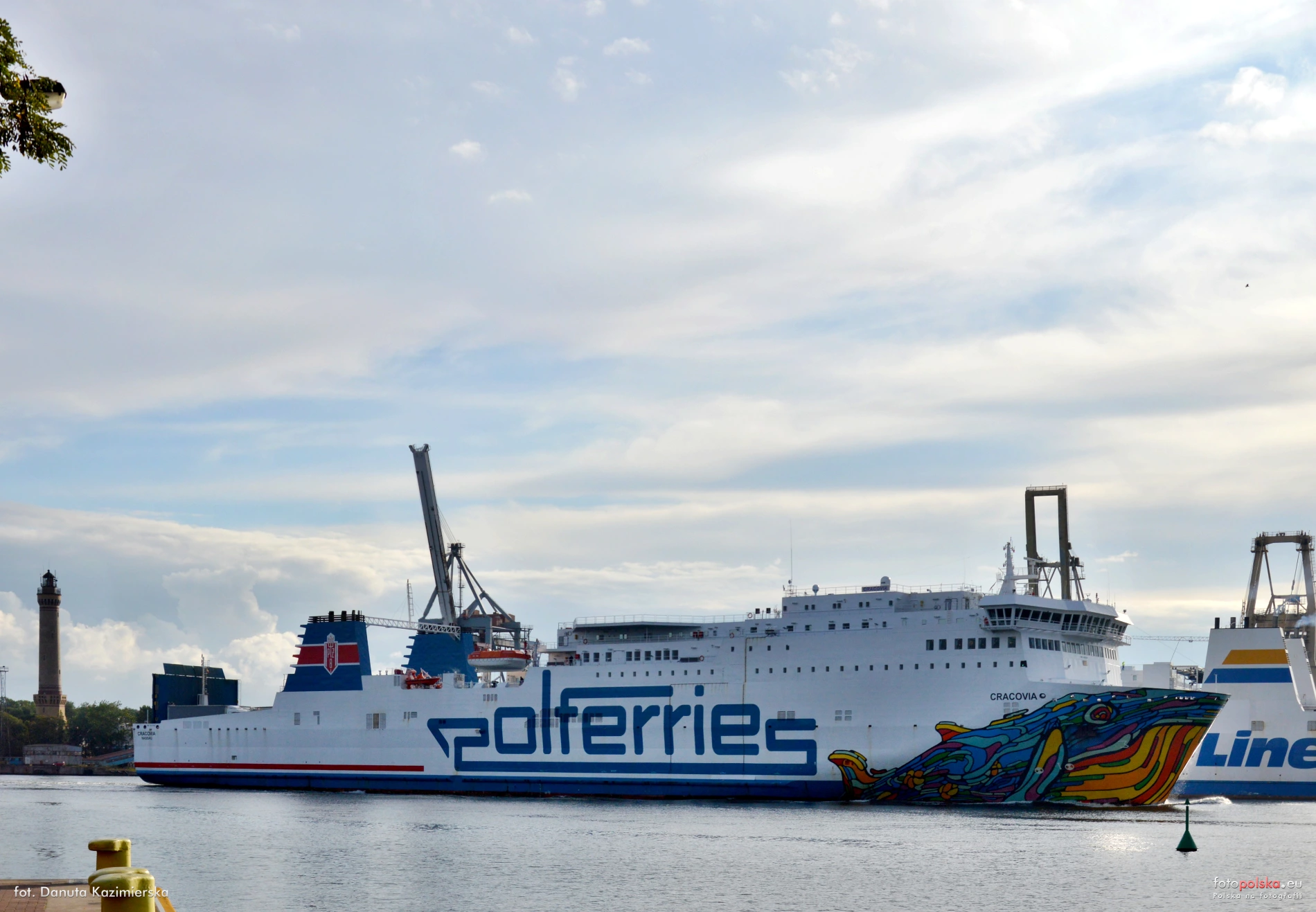 21 września 2021 , Prom Cracovia wpływa do portu Świnoujście. m/f Cracovia - zbudowany w 2002 roku. Po nabyciu w kwietniu 2017 roku jednostka została poddana modernizacji w szczecińskiej stoczni, podczas której została wykonana kafeteria i kawiarnia w części dziobowej. W trakcie modernizacji został pomalowany także dziób promu. Kolorowa grafika przedstawiająca wieloryba ma 900 m kw. Grafitti ma odniesienie do nazwy promu - autor inspirował się witrażami Stanisława Wyspiańskiego. Do jego stworzenia zużyto 275 litrów farby w 8 kolorach. Prom jednorazowo może przewieźć 650 pasażerów, 64 samochodów osobowych oraz około 98 samochodów ciężarowych długich + 26 samochodów ciężarowych krótkich. M/f Cracovia jest zatrudniona na linii Świnoujście - Ystad.Skomentuj zdjęcie |