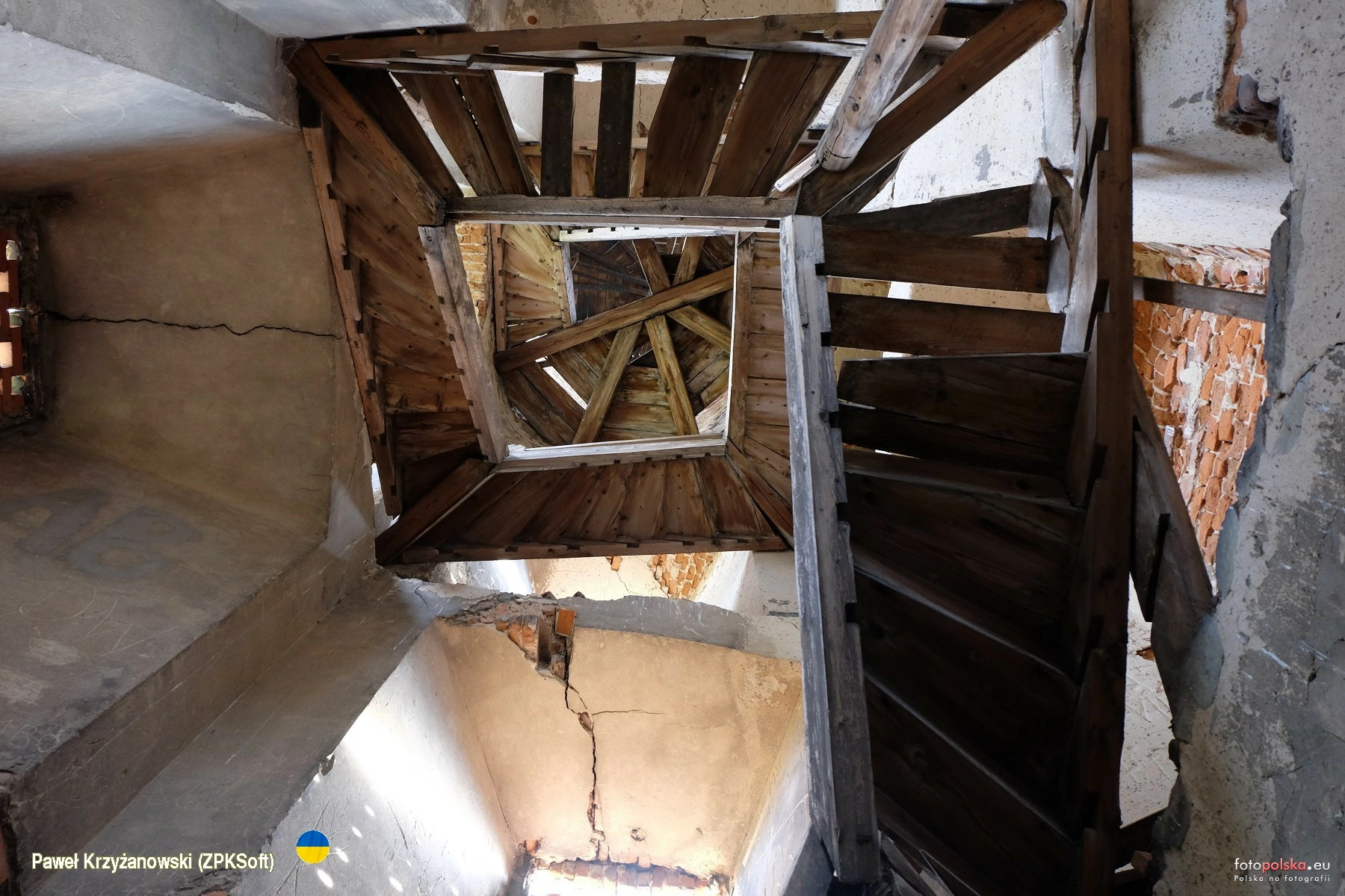 25 września 2022 , Wnętrze wieży dworu, którego początki sięgają XVI w. W swej historii mieścił również Żeński Obóz Służby Pracy Rzeszy nr 14/51 a po wojnie funkcjonowała tu szkoła podstawowa, potem świetlica a w części pomieszczeń urządzono mieszkania. Od kilku lat obiekt stoi opuszczony. Dostęp do wieży jedynie ze strychu - ciekawe czy zawsze tak było. Jak widać drewniane schody z dolnej części wieży poszły już dawno do pieca.Skomentuj zdjęcie