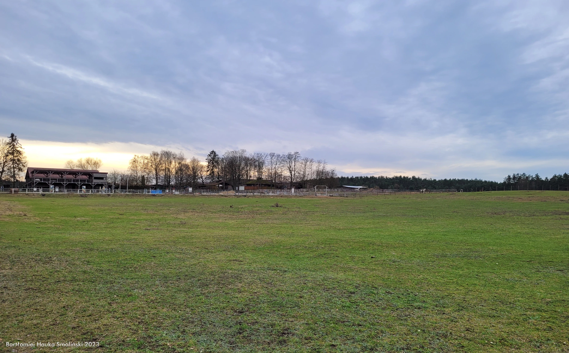 1 stycznia 2023 , Duży padok po północnej stronie stadniny, widok w kierunku południowym, na dalszym planie parkur, trybuna oraz główna stajnia.Skomentuj zdjęcie |