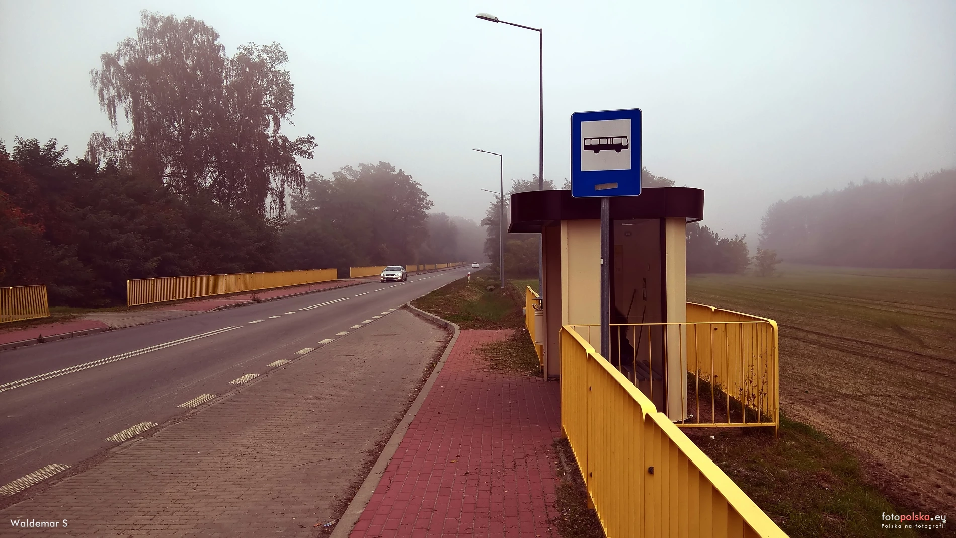 19 października 2017 , Malinowszczyzna. Widok na fragment Drogi Wojewódzkiej 747 we wsi z przystankiem komunikacji autobusowej.Skomentuj zdjęcie