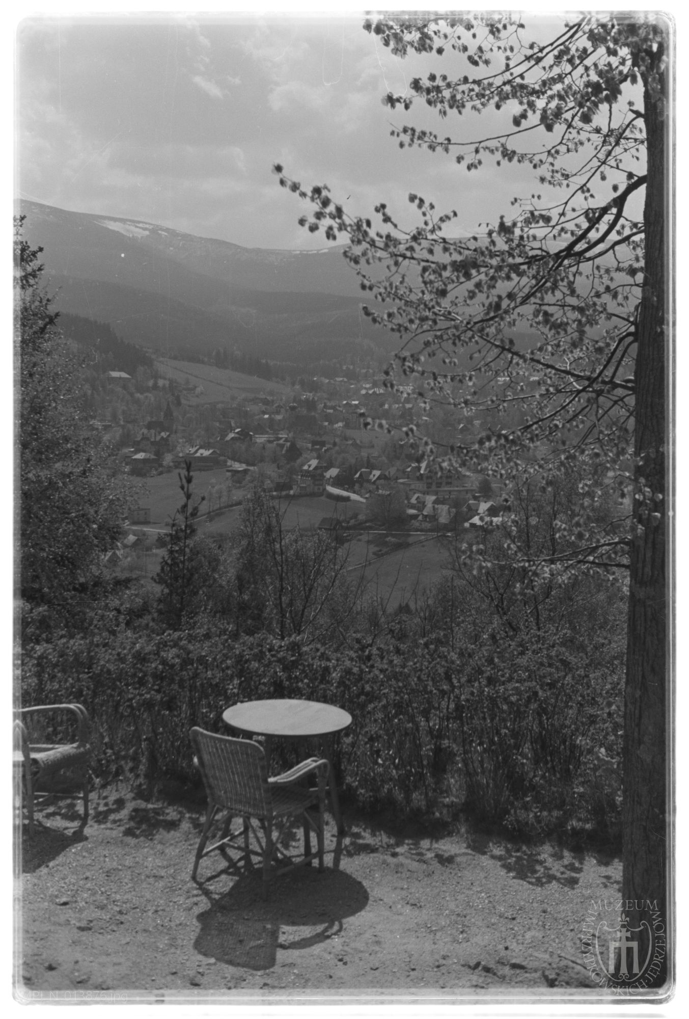 Lata 1945-1950 , Karpacz, panorama masywu górskiego z tarasu widokowego hotelu "Zamek Księża Góra".Skomentuj zdjęcie