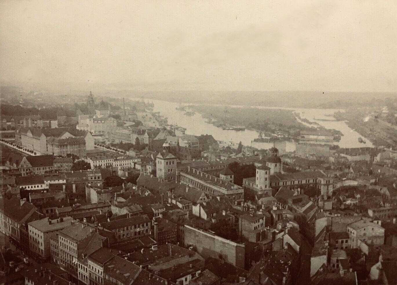 Lata 1914-1916 , Widok z wieży katerdy św.Jakuba. W lewym dolnym rogu fragment wschodniej strony Grosse Domstr. (ul. Farna), od nru 15 do 19, następnie wylot Pelzerstr. (ul. Kuśnierska) i dalej Grosse Domstr. 20 do 22. W prawym dolnym rogu widoczny fragment Fuhrstr. (ul. Grodzka), prowadzącej łukiem w kierunku dziedzińca Zamku. |
