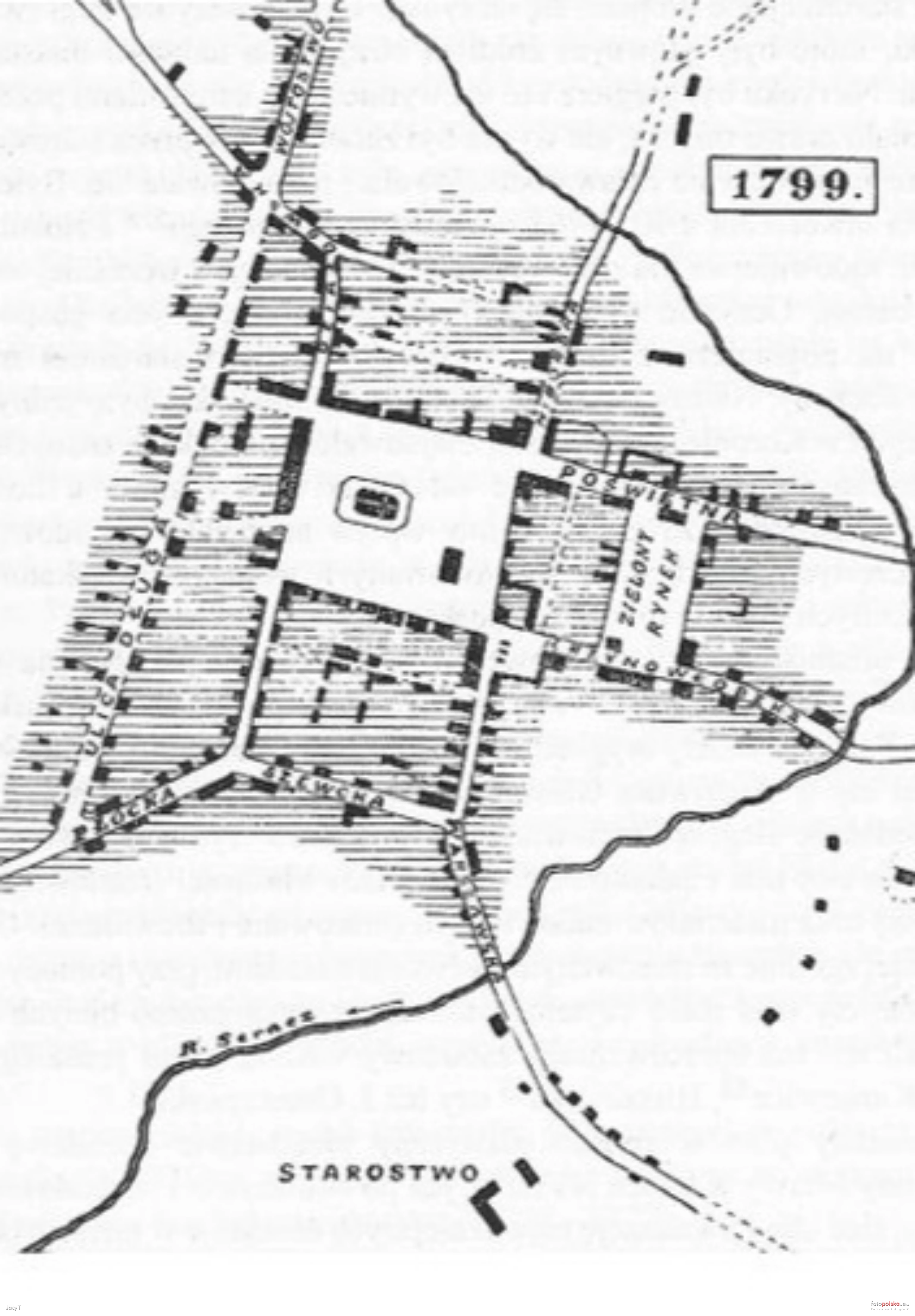 1799 , Plan miasta Mława z 1799 roku. Przedstawia między innymi położenie pierwszego murowanego kościoła w Rynku: "był usytuowany w centralnym miejscu rynku. Po wybudowaniu ponad sto lat później ratusza, po przeciwnej stronie kościoła, oba budynki symbolizowały władzę duchowną i świecką, umieszczone obok siebie w najważniejszym miejscu w mieście. Tu skupiało się życie gospodarcze miasta; na rynku organizowane były targi i jarmarki, przed rozpoczęciem których można było zapewne uczestniczyć w mszach świętych, prosząc o pomyślny przebieg załatwianych interesów."Skomentuj zdjęcie |