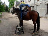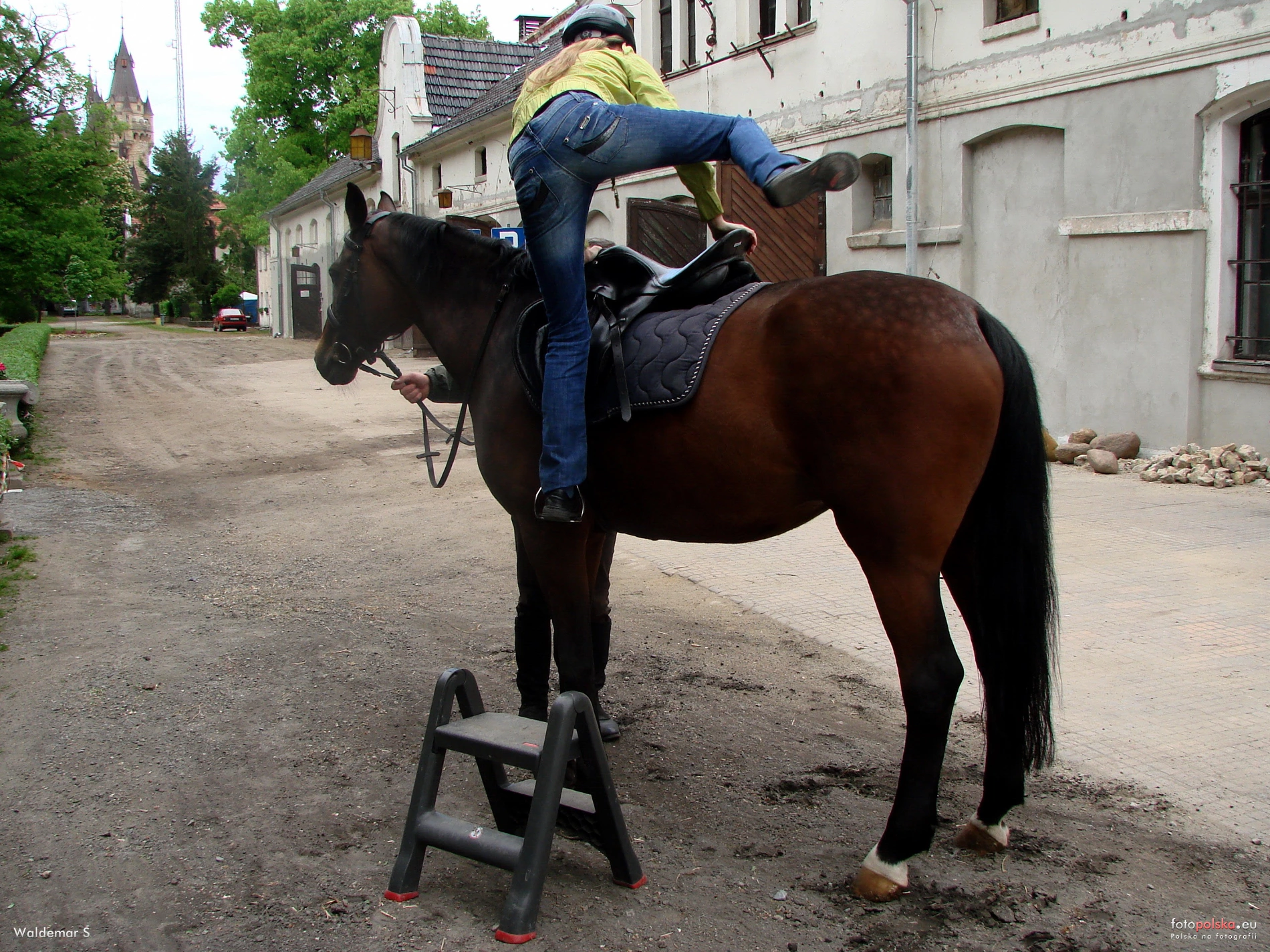 14 maja 2012 , Moszna, ul. Wiejska 26. Stajnia nr 1. Fragment budynku stajni, widok w kierunku pałacu. Na pierwszym planie pierwsza jazda konna, wsiadanie na konia.Skomentuj zdjęcie |