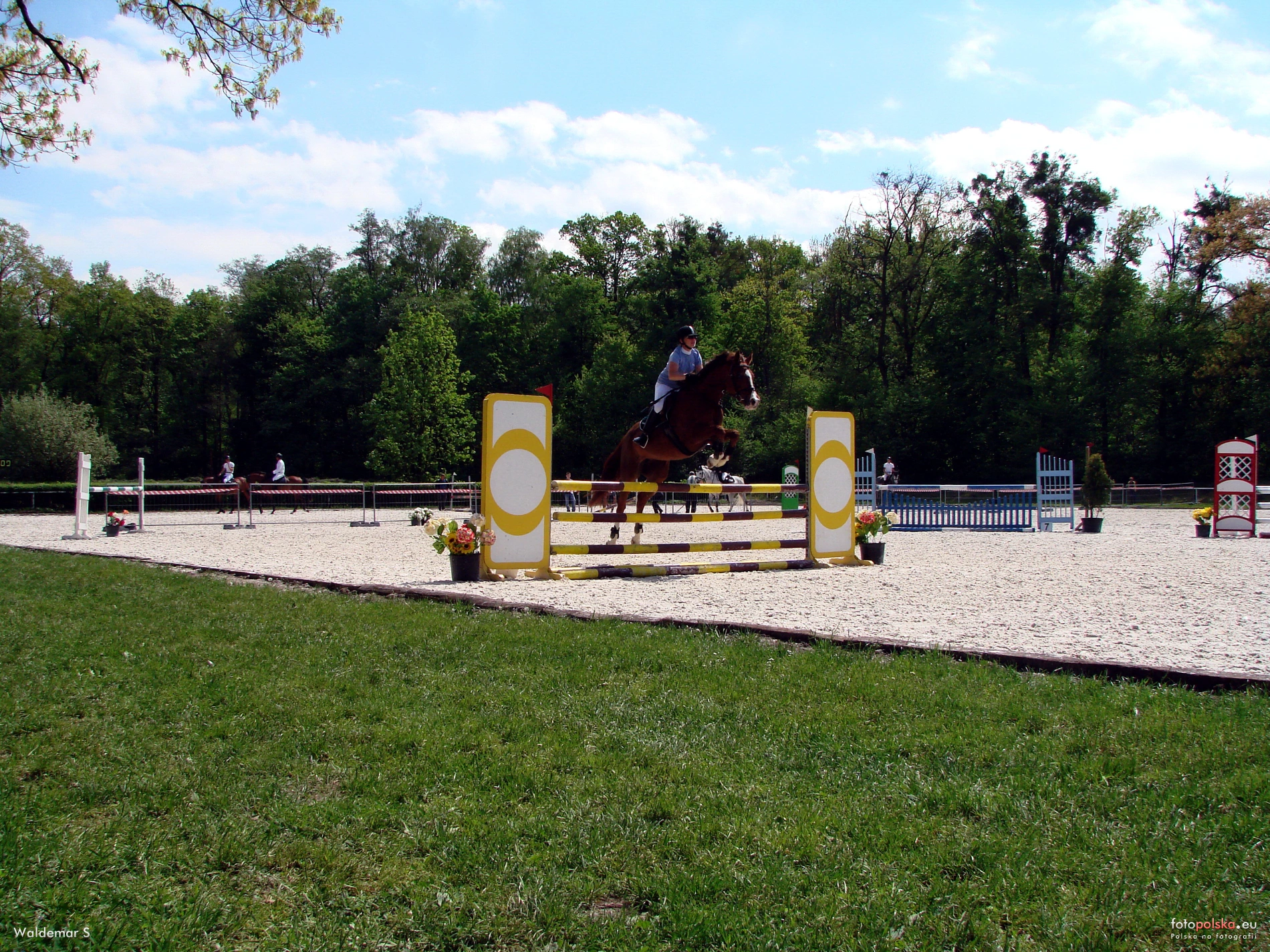 6 maja 2012 , Moszna, Stadnina koni. Hipodrom. Fragment obiektu, ujęcie w trakcie pokonywania przeszkody.Skomentuj zdjęcie |