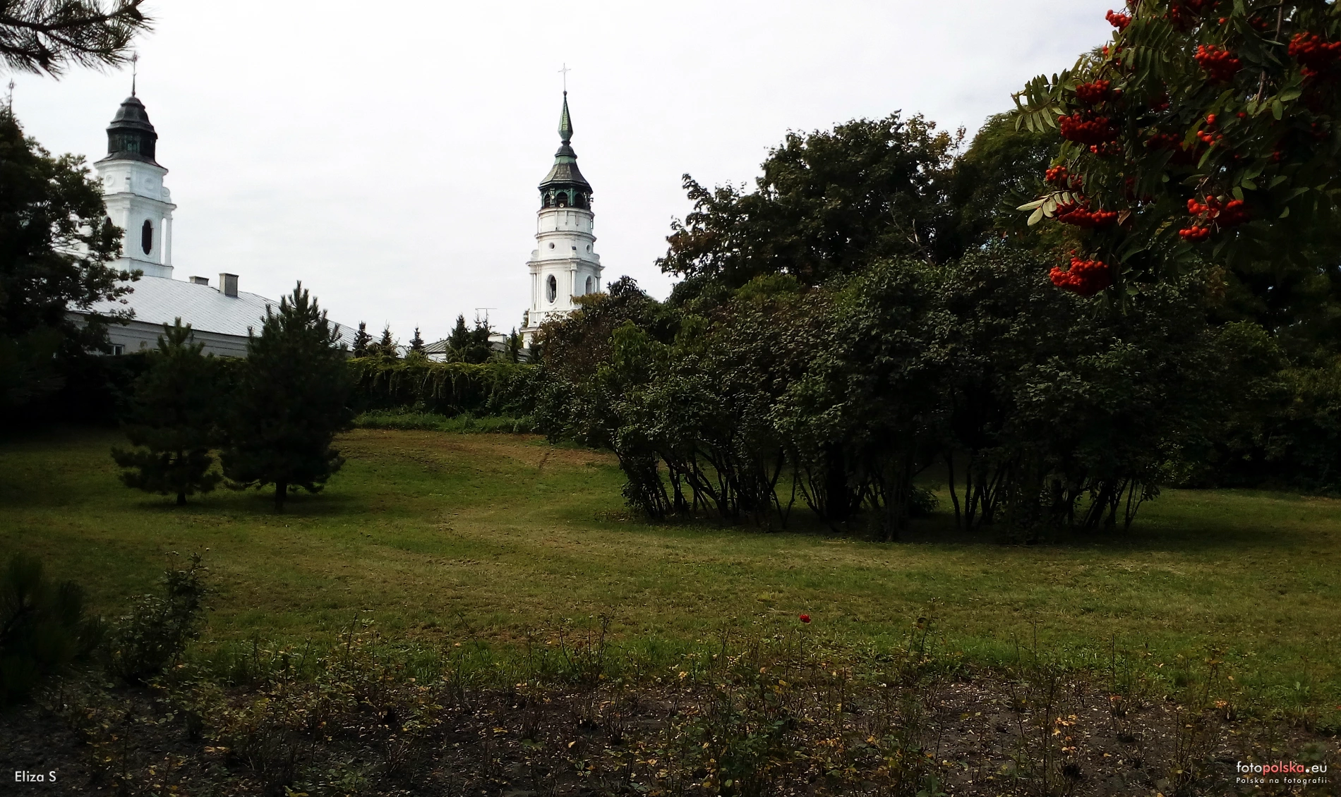23 sierpnia 2019 , Bazylika Narodzenia Najświętszej Maryi Panny. Dzwonnica. Widok na dzwonnicę z parku XXX-Lecia. Z lewej strony widoczny fragment prawej wieży bazyliki.