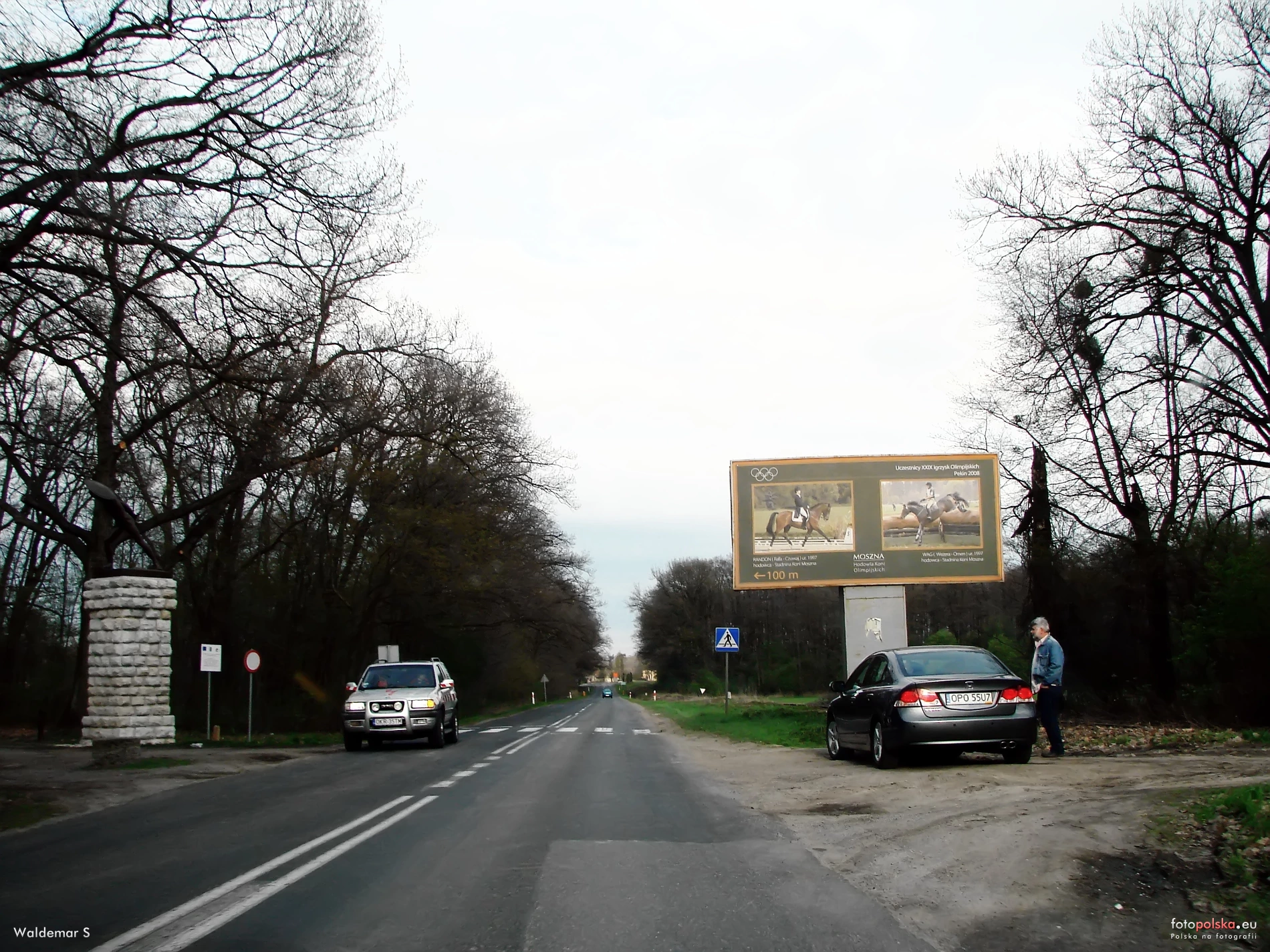 22 kwietnia 2012 , Moszna. Ulica Prudnicka. Fragment ulicy w kierunku ul. Zamkowej. Zdjęcie w ruchu przez szybę jadącego auta. Po lewej stronie widoczny fragment Gladiatorów (Brama Gladiatorów albo Brama z gladiatorami). Z prawej a poboczu baner reklamowy Stadniny Koni w Mosznej.Skomentuj zdjęcie |