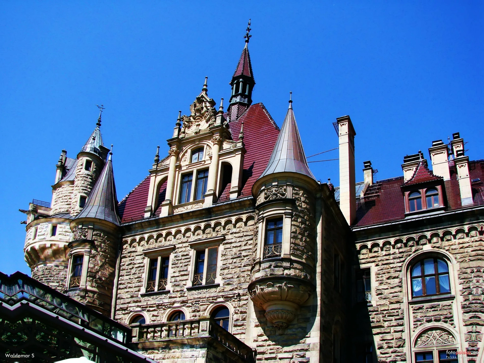 1 czerwca 2016 , Fragment elewacji skrzydła neogotyckiego od strony Stawu Kalusznik. Określenie pałacu w Mosznej "zamkiem" jest prostym nadużyciem, ponieważ zarówno jego architektura, jak i pełnione funkcje, nigdy nie miały nic wspólnego z obronnością, oprócz dekoracyjnego, neogotyckiego fragmentu wschodniego skrzydła, którego styl historyczny, nawiązuje ( lecz wyłącznie estetyką ) do średniowiecznych budowli. Trudno byłoby funkcję obronną przypisać kruchej, pałacowej oranżerii, która wyrasta u podstawy "zamkowej" elewacji wschodniej. Hrabia Franciszek przeczuwał skąd może nadejść największe zagrożenie i stąd zaakceptował akurat w tym miejscu zamkową, odstraszającą formę architektoniczną, nawiązującą do średniowiecznych romańskich budowli obronno - sakralnych.Skomentuj zdjęcie |