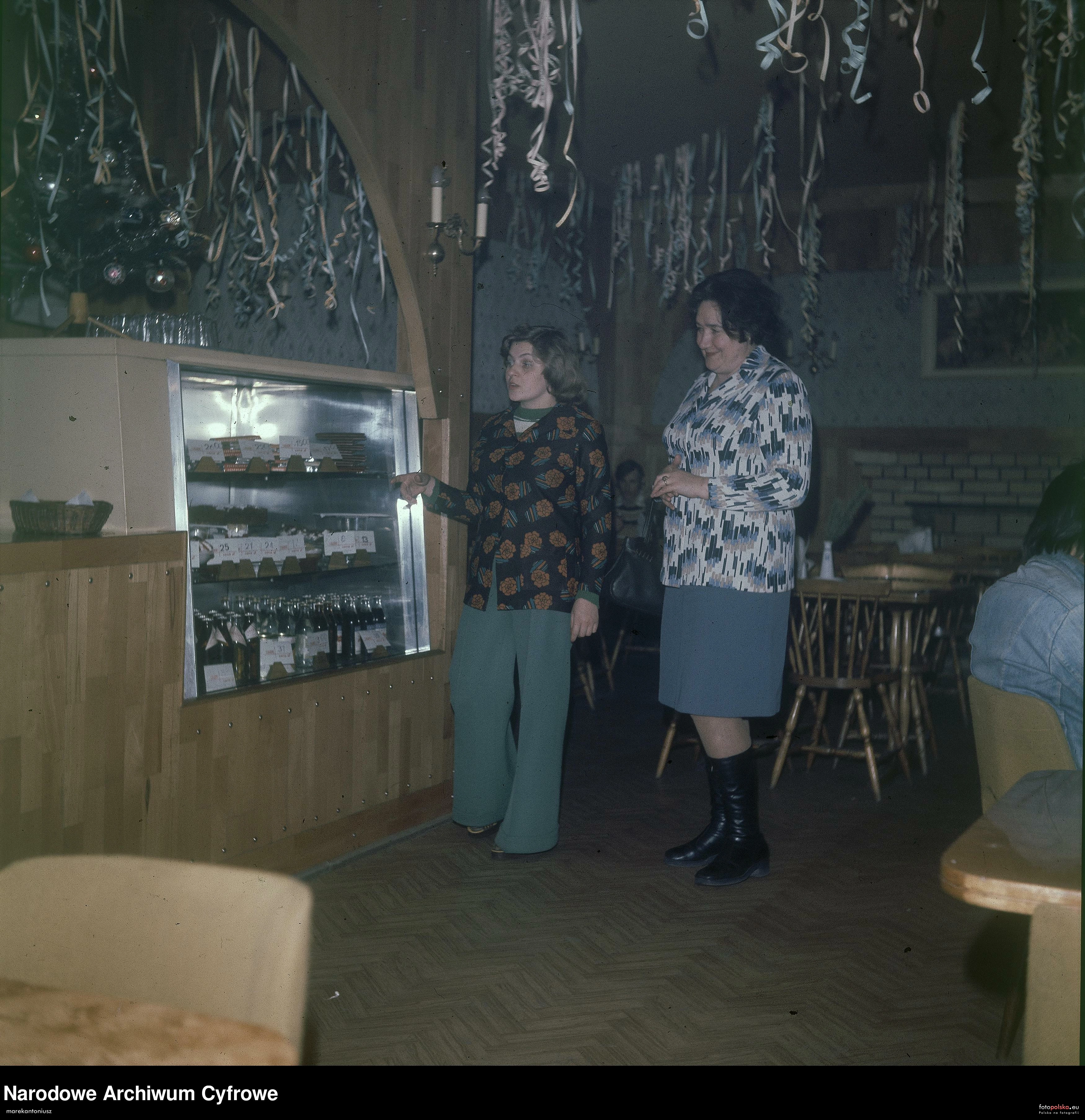 1977 , Janina Fuśnik, kierownik oddziału Wołomin WSS Społem i nierozpoznana kobieta przy ladzie chłodniczej z ciastkami i napojami.Skomentuj zdjęcie |