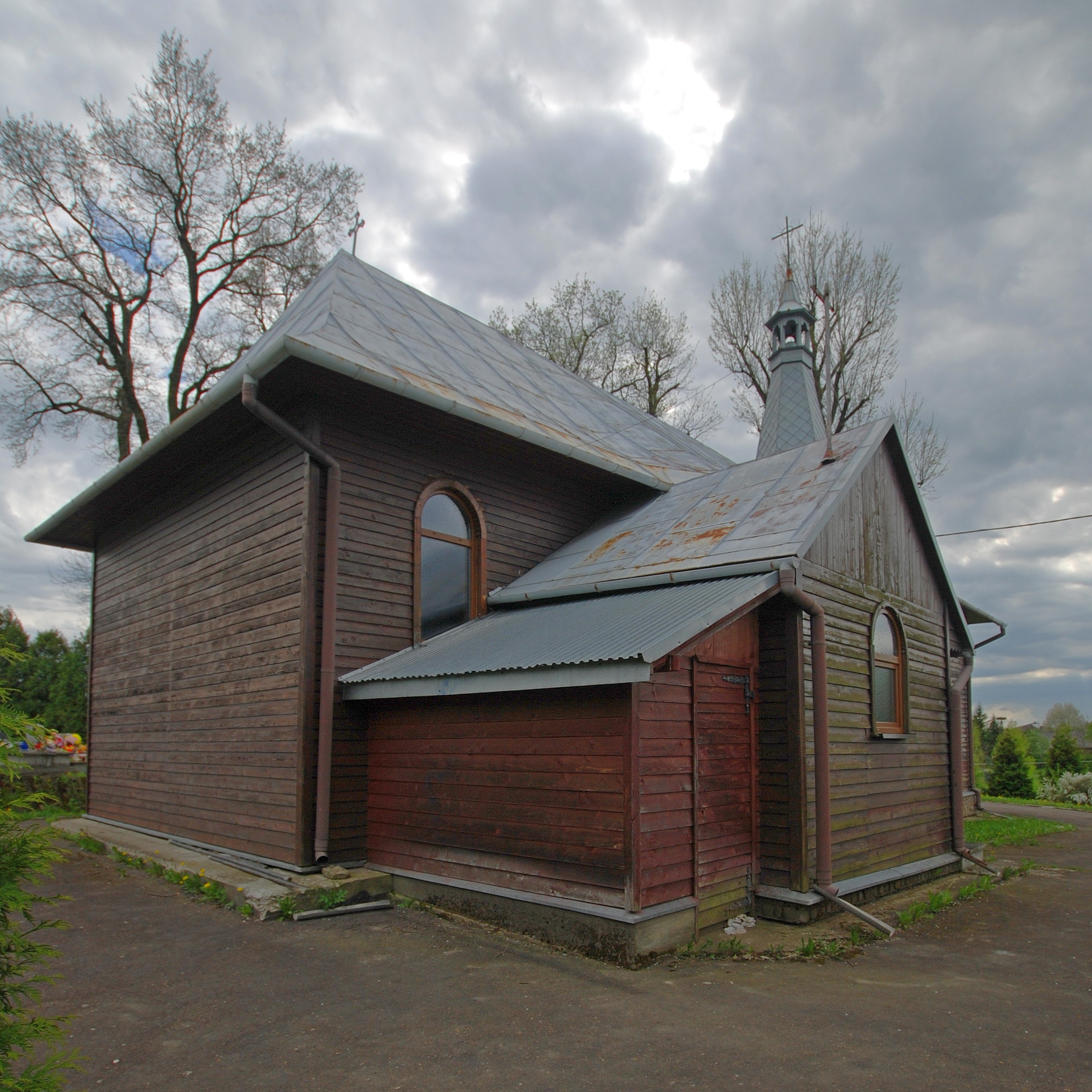 Kościół MB. Królowej Polski więcej zdjęć (12) Zbudowano: 1863 Dawniej: Cerkiew greckokatolicka Narodzenia NMP Historia. Cerkiew greckokatolicka p.w. Narodzenia NMP z 1863 r. Gruntownie przebudowana w latach 70 XX w. Od 1946 r. kościół rzymskokatolicki p.w. MB Królowej Polski. Remontowana w latach 90 XX w. Budowa i wyposażenie. Cerkiew drewniana, konstrukcji zrębowej. Orientowana. Dwudzielna. Prezbiterium mniejsze od nawy, zamknięte prostokątnie z boczną zakrystią. Kruchta od frontu nawy. Dach jednokalenicowy, kryty blachą z ośmioboczną wieżyczką na sygnaturkę w frontowej części nawy. Zwieńczoną hełmem iglicowym z latarnią. Wnętrze wyłożone boazerią. Strop płaski. Chór muzyczny wsparty na dwóch słupach z arkadami. Ołtarz główny i dwa małe ołtarze boczne. Dzwonnica współczesna, metalowa i otwarta. Źródło: |