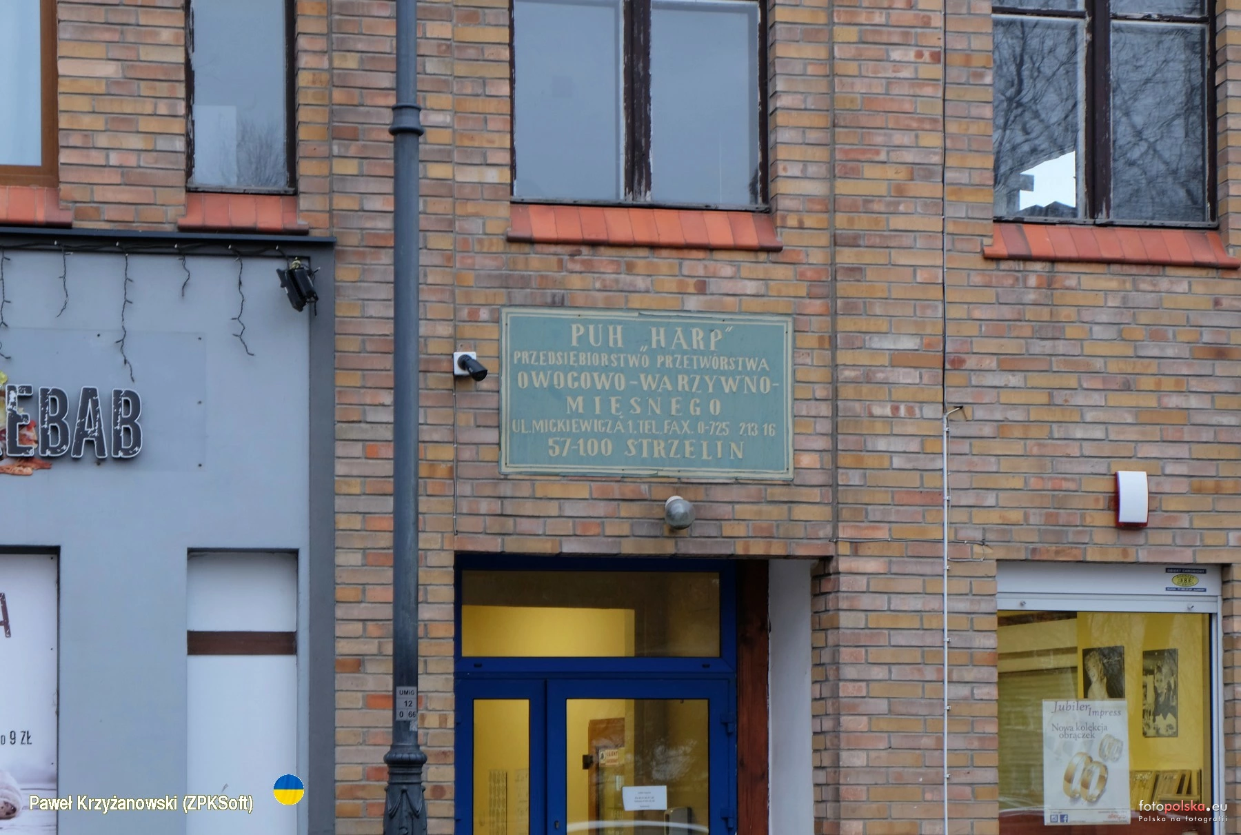 17 lutego 2023 , Mickiewicza 1 - budynek gdzie mieszczą się rozmaite, często zmieniające się firmy. Sam obiekt też ulegał licznym przeróbkom, należał wraz z terenem do fabryki konserw. Po firmie HARP pozostała tablica od strony ulicy.Skomentuj zdjęcie