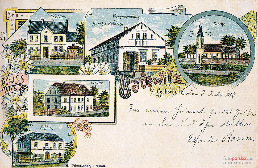 1899 , Pocztówka przedstawiająca nieistniejący już barokowy pałac, a także budynek szkoły, plebani i sklepu w centrum wsi. Kościół przebudowano trzy lata po wysłaniu tej pocztówkiSkomentuj zdjęcie |