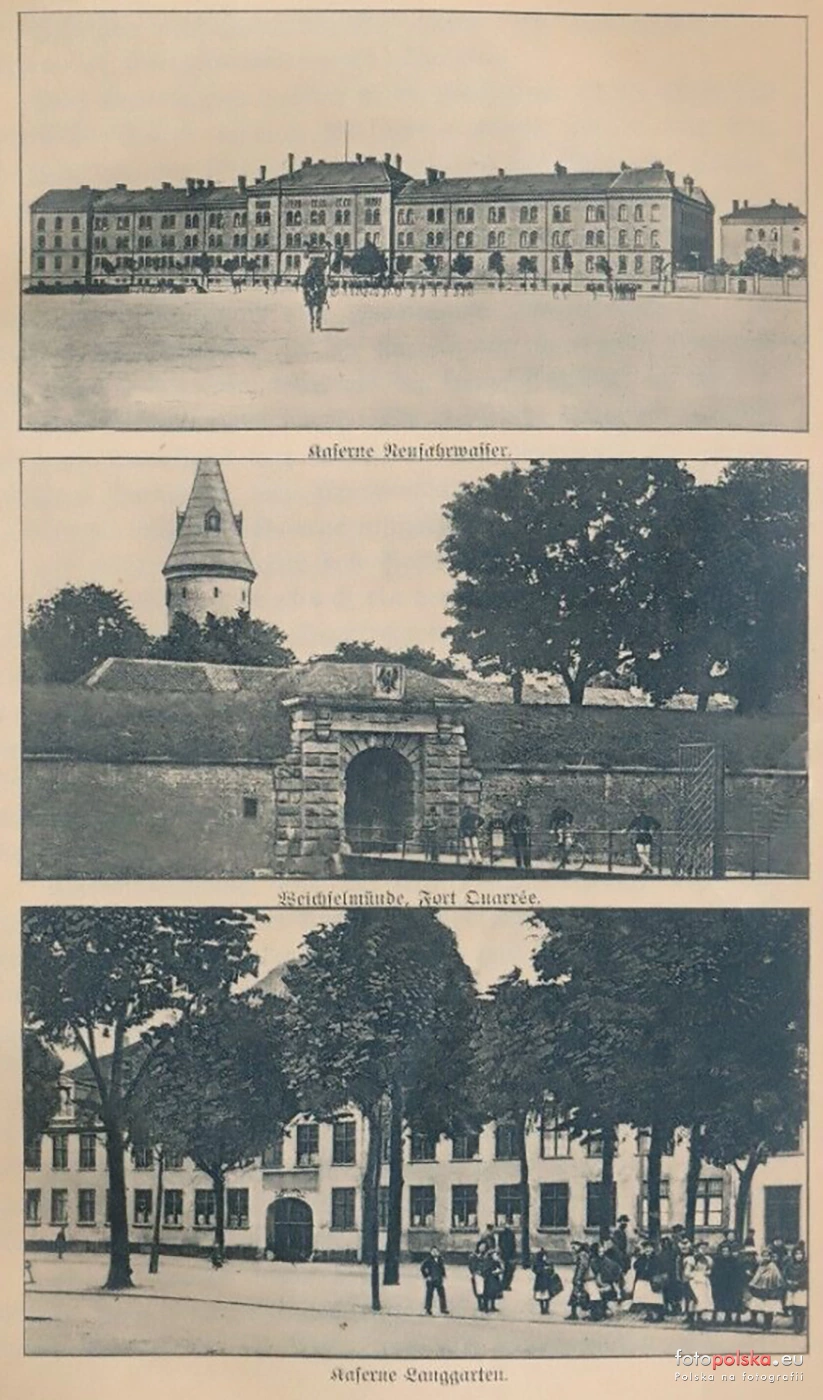 1906 , Danziger Infanterie-Regiment Nr. 128: od góry koszary w Nowym Porcie, brama fortu carre Twierdzy Wisłoujście, stare koszary przy Długich Ogrodach
