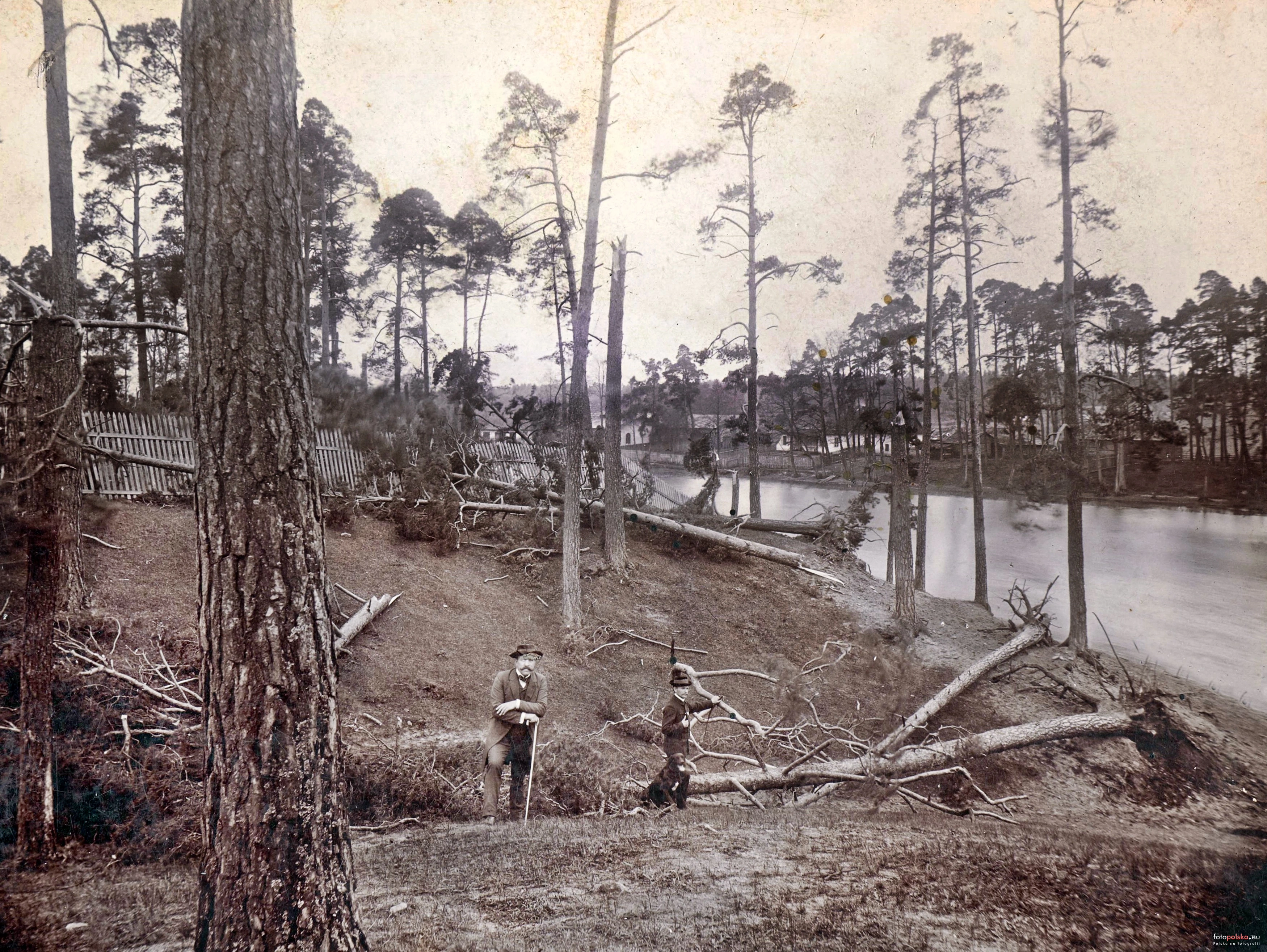 1911 , Fragment zabudowy miejscowości w okolicy ulicy Langiewicza w pobliżu mostu, widoczne skutki huraganu.Skomentuj zdjęcie