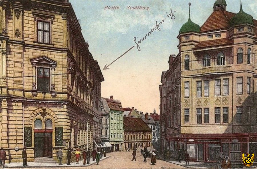 1913 , Ulica Wzgórze w 1913 r. Widoczne dwie charakterystyczne kamienice - siedziba Komunalnej Kasy Oszczędności (dzisiejsza Patria) po lewej i Franciszka Kriegera (nr 20) po prawej.Skomentuj zdjęcie