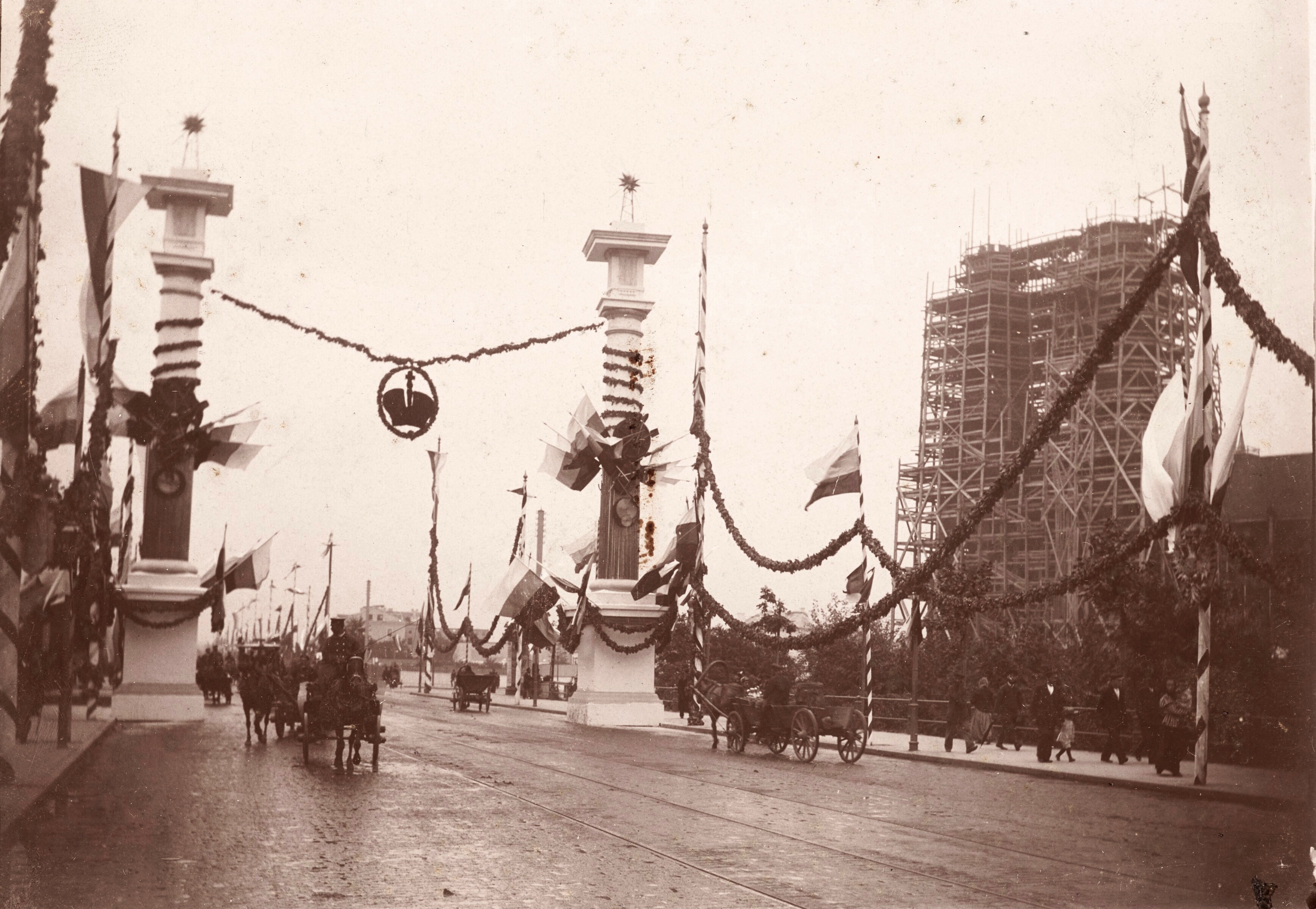 31 sierpnia 1897 , Ulica Aleksandryjska (obecnie Solidarności) udekorowana na przyjazd cara Mikołaja II. Uwagę zwraca pnący się do góry Florian.Skomentuj zdjęcie |