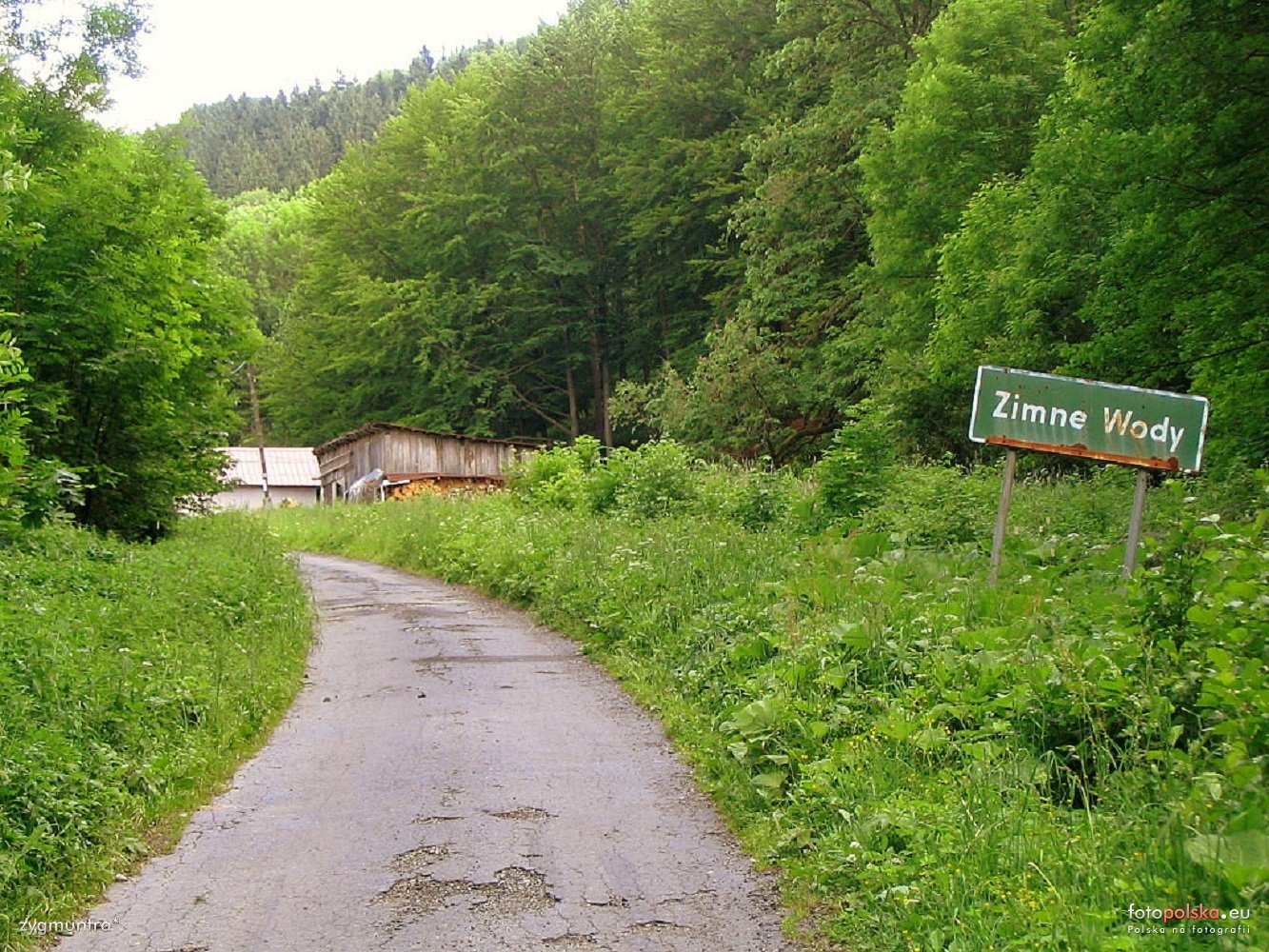 czerwiec 2005 , Wjazd do Zimnych Wód - do 2008 r. administracyjnie stanowiącej część Jawornicy. Wg mojego rozeznania znajdują się tutaj trzy lub cztery zamieszkane budynki. Granica administracyjna pomiędzy Jawornicą a Zimnymi Wodami biegnie wzdłuż widocznej drogi, stąd domy po jej lewej stronie przynależą do Jawornicy.Skomentuj zdjęcie