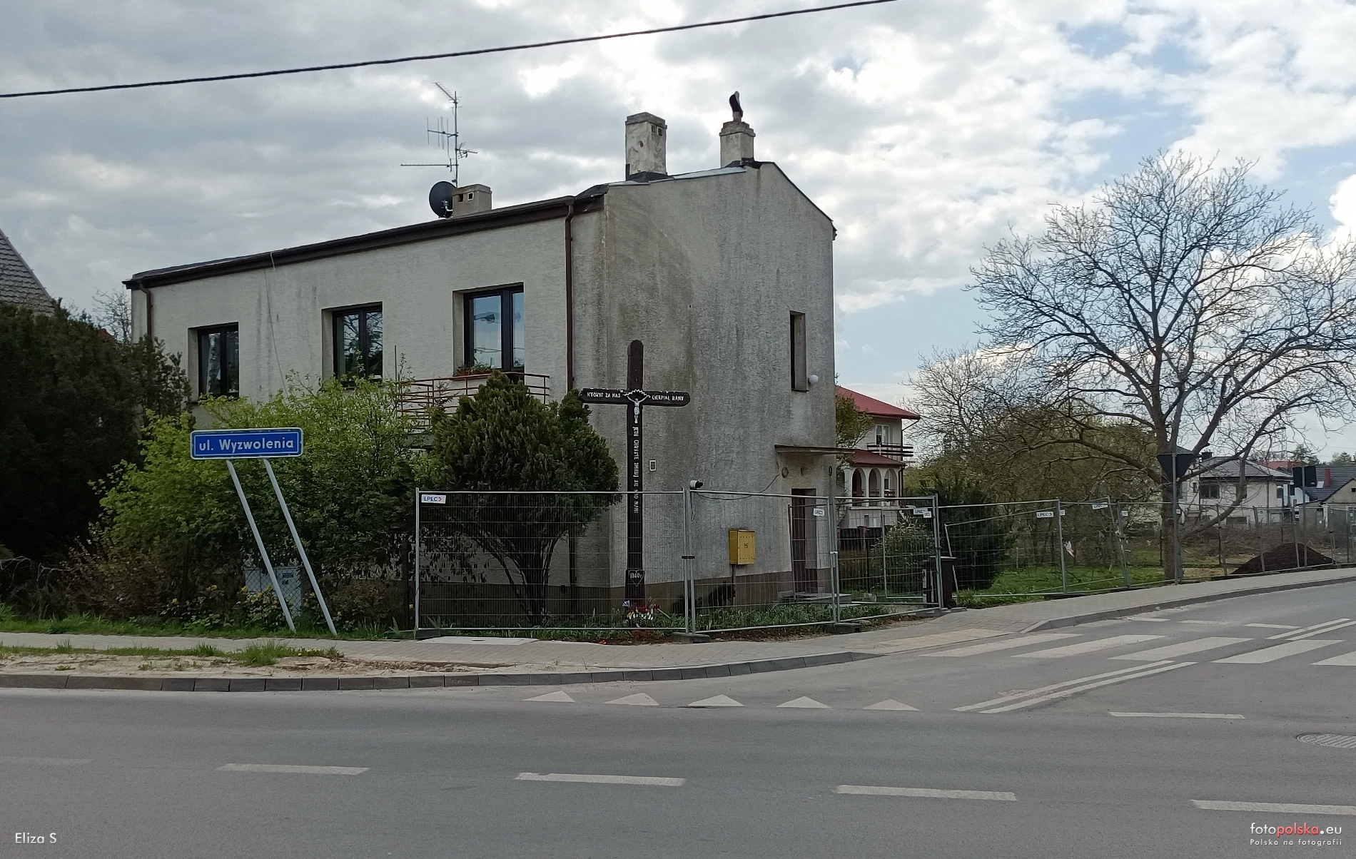 22 kwietnia 2023 , Wilcza 9. Przed domem stoi krzyż przydrożny. W lewo ul. Wyzwolenia.Skomentuj zdjęcie