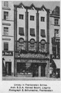 1927 , Kamienica na ząbkowickim rynku po przebudowie wg projektu legnickiego architekta Konrada Beichta w l. 20. XX w. Jak cała północna ściana placu, kamienica padła ofiarą bezmyślnych wyburzeń w l. 60. XX w. Wygląd kamienicy przed przebudową można zobaczyć tu: (2. od prawej względnie 10. od lewej strony).Skomentuj zdjęcie