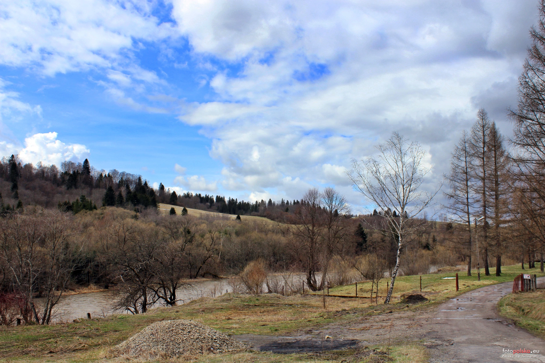 1 kwietnia 2023 , Fragment rzeki San, w pobliżu mostu drogowego, widoczne zabudowania po stronie zachodniej i droga prowadząca do tartaku.Skomentuj zdjęcie |