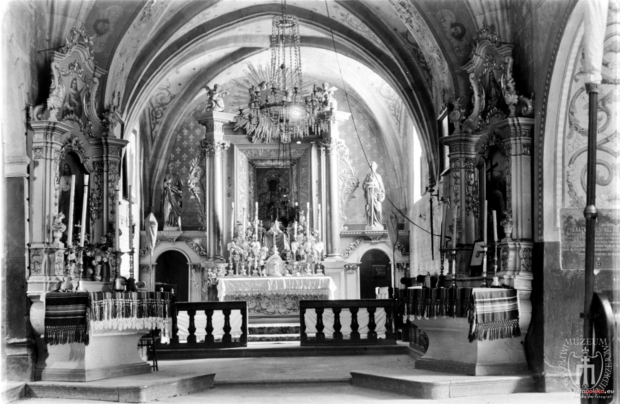 styczeń 1940 , Kościół św. Piotra i Pawła. Prezbiterim, ołtarz główny późnobarokowy (z figurami św. Piotra i Pawła oraz w obramowaniu złoconych kolumn umieszczona została kopia obrazu Matki Bożej Częstochowskiej w sukience) i dwa ołtarze boczne rokokowe. Widoczne sklepienie gwiazdowe żebrowane.Skomentuj zdjęcie |