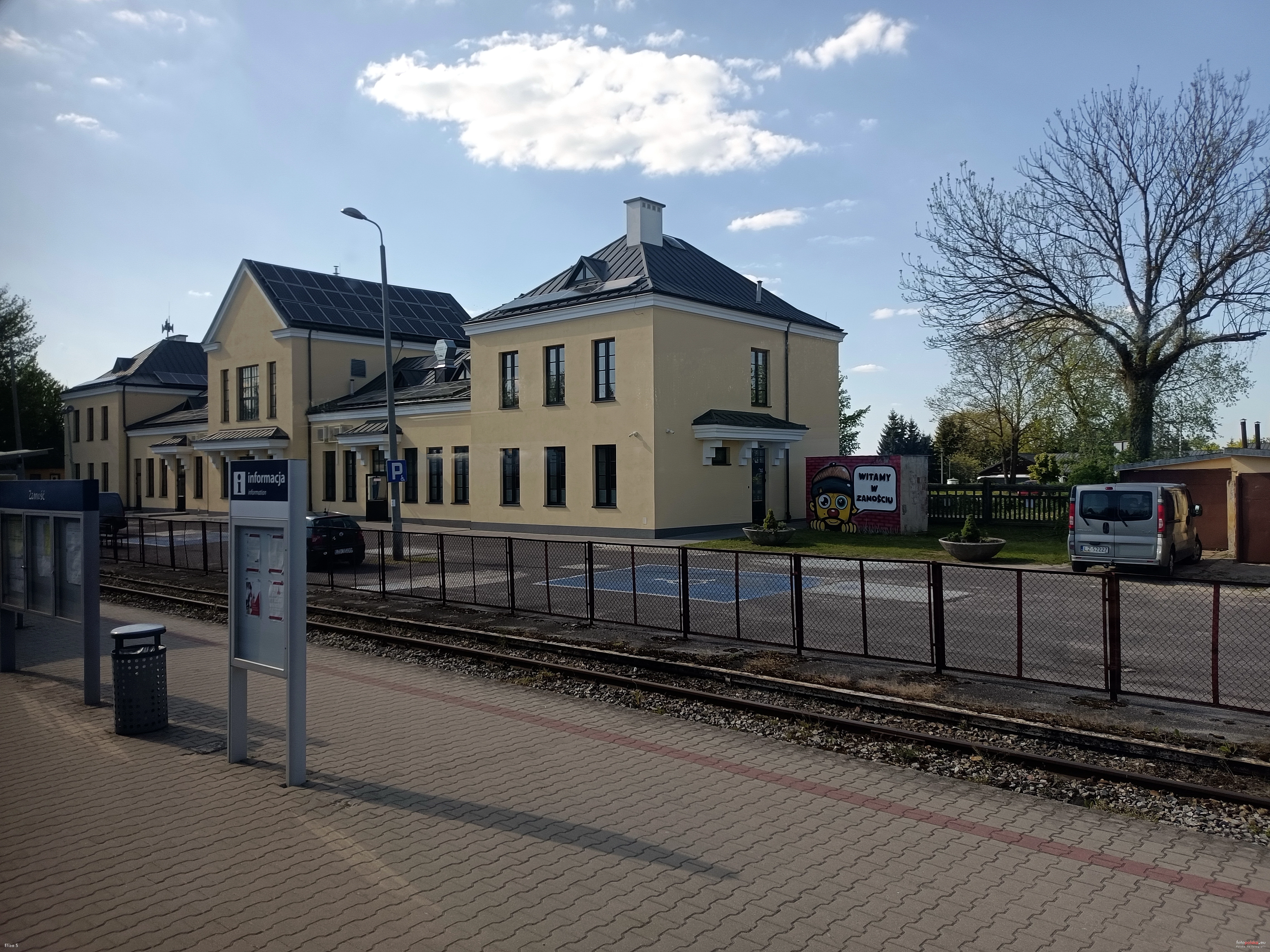 11 maja 2023 , Stacja kolejowa Zamość. Peron 1. W głębi budynek dworca kolejowego Zamość w którym obecnie mieści się Centrum Integracji Społecznej.Skomentuj zdjęcie