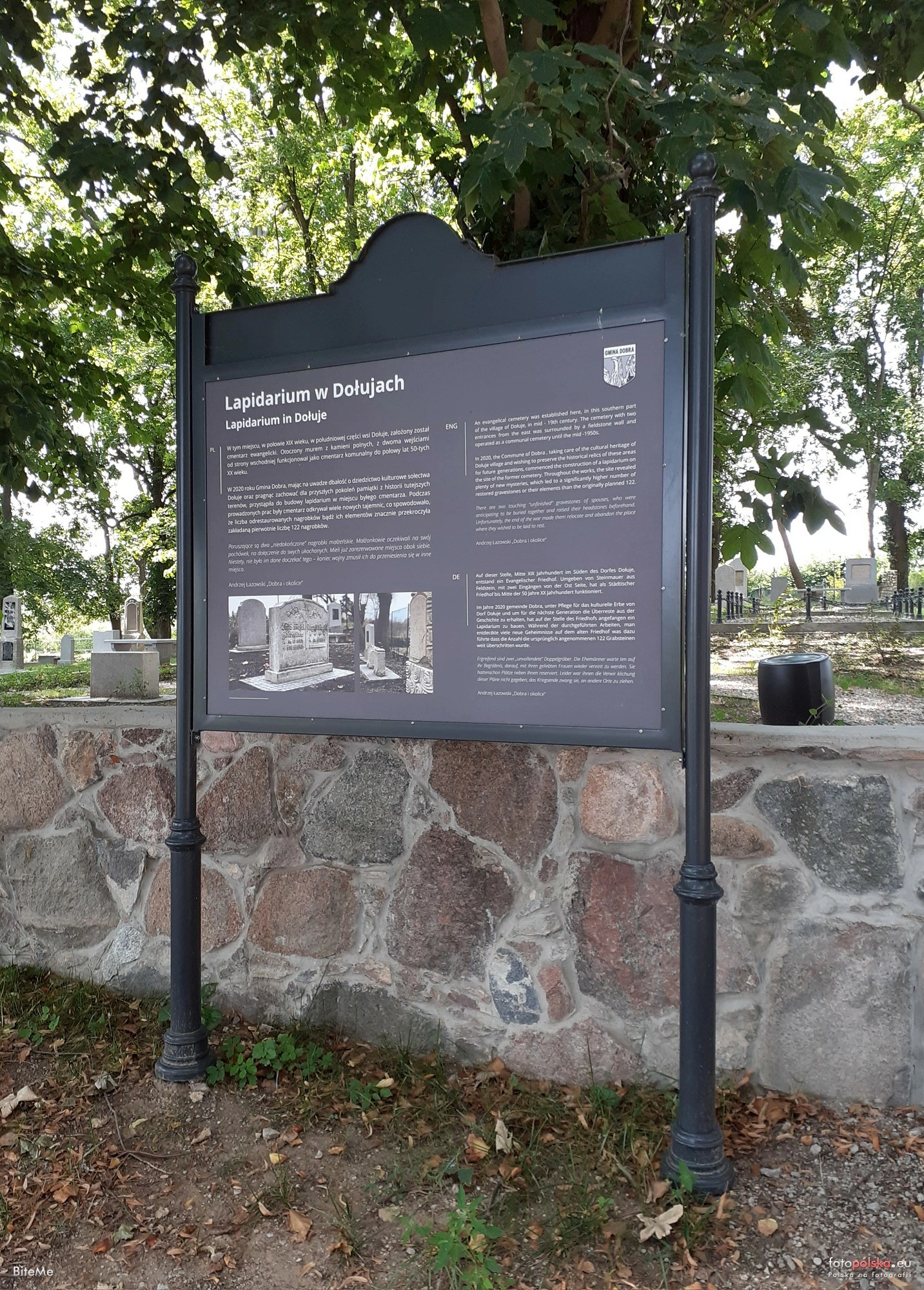 13 sierpnia 2021 , Tablica przed dawnym cmentarzem, obecnie lapidarium, w Dołujach.Skomentuj zdjęcie |