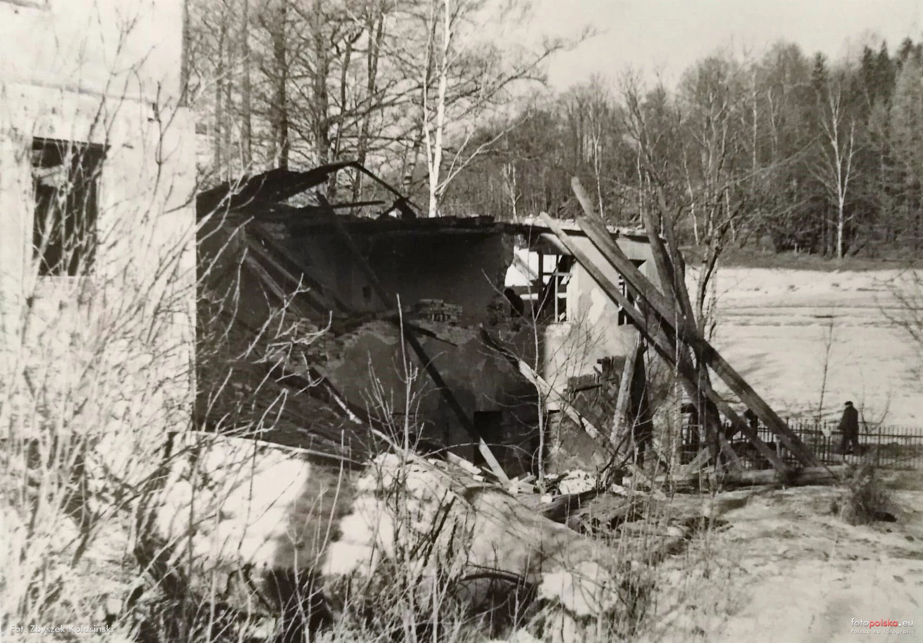 1977 , Rozbiórka nieistniejącej, pokrytej dachem dwuspadowym części budynku przy Źródlanej 7-8 w Kowarach widocznej po lewej na widokówce: Widok od zaplecza budynku. |