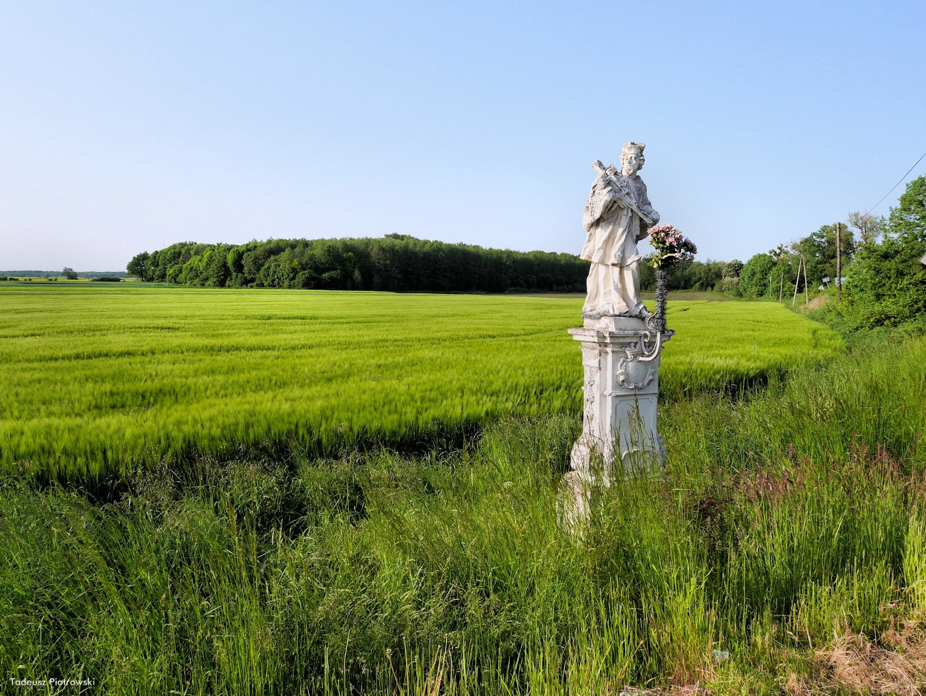 28 maja 2023 , 2023. "Na skraju wsi, przy moście nad Białką stoi kamienna barokowa pobielona rzeźba Jana N. na okazałym cokole z wolutami i pałąkiem latarni umarłych. XVIII wiek. Święty wzrokiem adoruje krucyfiks. Stan rzeźby dobry, choć część biretu i tył głowy uszkodzone. Ładny dom usytuowany niegdyś za figurą został rozebrany, a spore drzewa ocieniające ją - wycięte, jak to mają w zwyczaju mieszkańcy tego chorego kraju"Skomentuj zdjęcie |