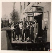 Lata 1939-1945 , Ziębice - hotel "Schlesischer Hof" (Śląski dwór) przy ulicy Kolejowej (Bahnhofstrasse). Zdjęcie kilku osób, w tym żołnierzy niemieckich, zrobione przed budynkiem (w tym czasie był tam hotel i restauracja). Posiadam kilka innych zdjęć, na których są Ci sami żołnierze. Przebywali oni w tym czasie, jako ranni, w lazarecie w Ziębicach. Na odwrocie wszystkich fotografii jest pieczątka zakładu fotograficznego w Ziębicach.Skomentuj zdjęcie