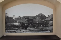 15 czerwca 2022 , Chęciny, ul. Małogoska 7. "Niemczówka", Punkt Informacji Turystycznej - podwórko z wystawą plenerową. - na zdjęciu jest widoczny tył domu Niemcówka z widoczną bramą i fragment "Wielkiej Sali"Skomentuj zdjęcie