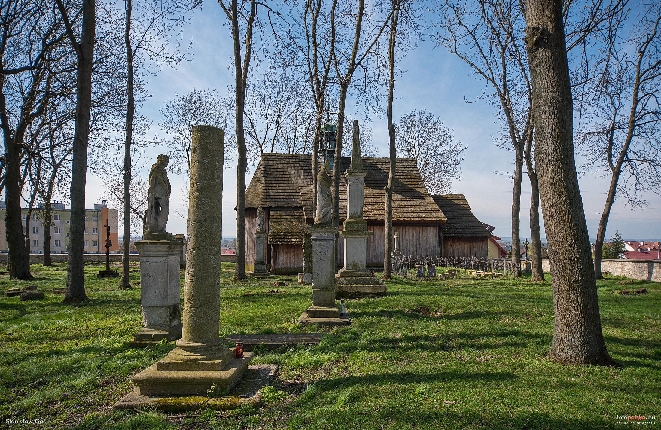 Stary cmentarz przy kościele św. Leonarda. więcej zdjęć (15) Kościół św. Leonarda więcej zdjęć (27) Atrakcja turystyczna Zbudowano: 1699 Dawniej: Kościół cmentarny Zabytek: A/16/1-3 z 4.11.1947 i 21.02.1966 Kościół zbudowany został z drewna modrzewiowego przez cieślę Walentego w 1699 roku, posiada prezbiterium zwrócone na wschód. Od zachodu posiada kruchtę, węższą i niższą od nawy głównej. Naprzeciw kruchty znajduje się prezbiterium zakończone trójboczną absydą. Prezbiterium, w przeciwieństwie do kruchty, które posiada osobny dach, pokrywa wspólny z nawą główną, zaokrąglony nad absydą, gontowy dach, nie tworząc od wschodu szczytu. Kościół posiada konstrukcję zrębowo-słupową. Najważniejszym elementem wyposażenia prezbiterium jest główny ołtarz późnobarokowy, będący ozdobną kompozycją architektoniczno-rzeźbiarską z centralnie usytuowaną figurą patrona kościoła p. w. św. Leonarda. wokół kościoła rozpościera się stary, nieczynny cmentarz otoczony kamiennym murem. Na cmentarzu zachowało się kilka różnych typów nagrobków w formie krzyży (kamiennych i żeliwnych), pełnowymiarowych figur (Chrystus Nazareński, Matka Boska) oraz kolumna kamienna, opleciona wicią roślinną z przełomu XVII/XVIII w. Obok apsydy kościoła znajduje się kwatera z grobem Rzewuskich z oryginalną tablicą umieszczoną na klasycystycznej steli (jeden z Rzewuskich, Feliks, był założycielem buskiego kurortu). za : /p>