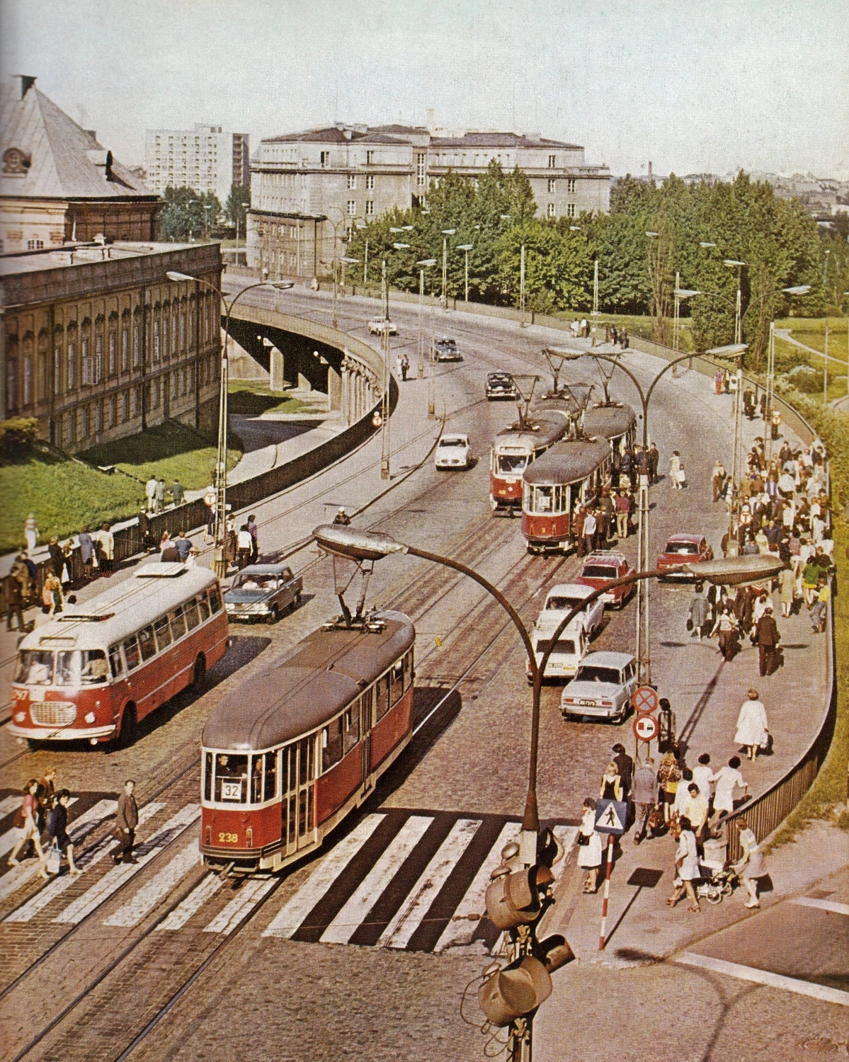 Lata 1972-1975 , Trasa W-Z. Na pierwszym planie tramwaj 13N nr 238, w tle wagony 418 (?) i 3. Zdjęcie z albumu "Warszawa od wyzwolenia do naszych dni", wyd. Sport i Turystyka 1977.Skomentuj zdjęcie