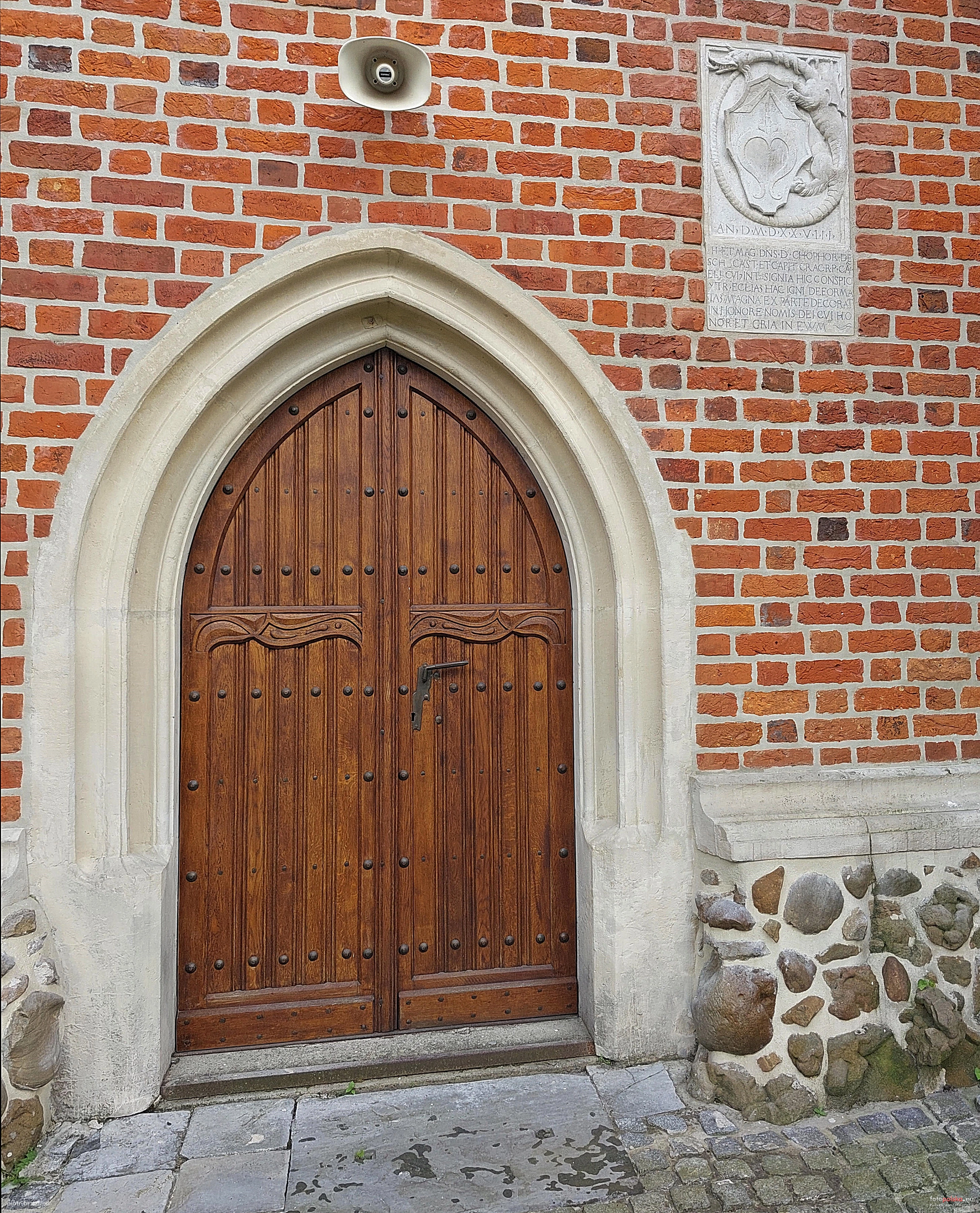 To portal północny. Po prawej tablica pamiątkowa z herbem Szydłowieckich informująca o odbudowie powyższego kościoła. Odbyło się to w 1528 roku z fundacji Krzysztofa Szydłowieckiego, kanclerza królewskiego. Smok na płaskorzeźbie - świetny !