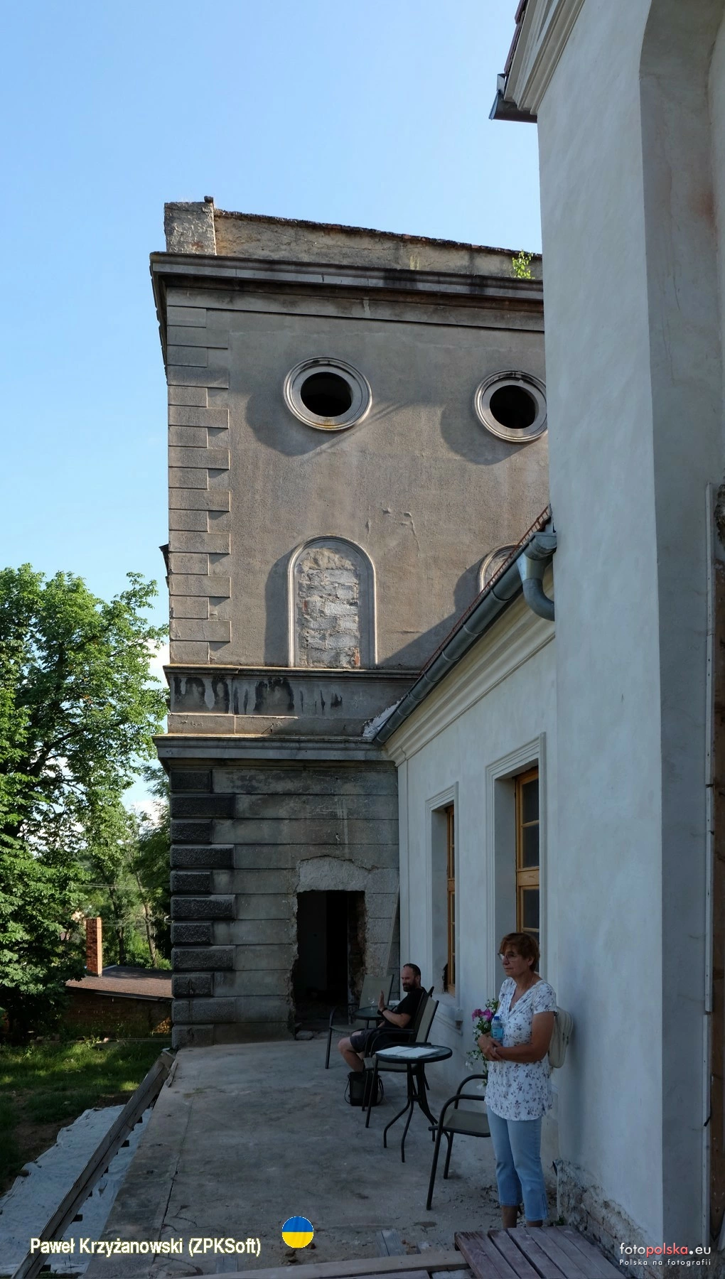 25 czerwca 2023 , Klasycystyczny dwór w Kalinowicach Górnych został zbudowany prawdopodobnie w 1827 r. przez Ernsta von Förstera. Do lat 90. XX wieku w tympanonie frontowym widniała data „1827”. Rozbudowany w 1885 r. o wieżę w stylu baroku francuskiego i taras frontowy przez ówczesnego właściciela Hermana Hahna. Jednak pozostałości sklepień piwnic (kolebkowe i krzyżowe) mogą wskazywać na datowanie znacznie wcześniejsze, być może nawet i 1600 r. Po wojnie obiekt dostał miejscowy PGR i... dalej już nastąpiła typowa destrukcja. Od 2017 r. założona Fundacja Ratowania Dworu i Folwarku Kalinowice Górne mozolnie przywraca do życia dwór i obiekty towarzyszące. Spojrzenie na wieżę z tarasu wejściowego. Jest plan podwyższenia jej do pierwotnej wysokości.Skomentuj zdjęcie