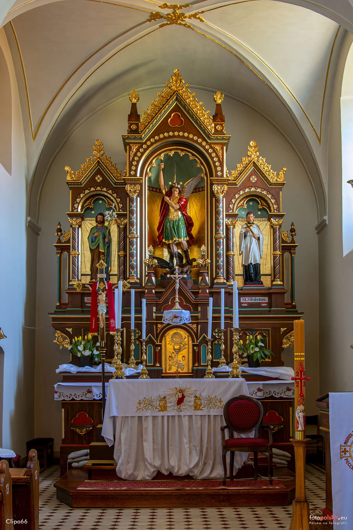 1 maja 2023 , Główny ołtarz posiada fragmenty snycerki barokowej. Centralne miejsce zajmuje posąg św. Michała Archanioła.Skomentuj zdjęcie |