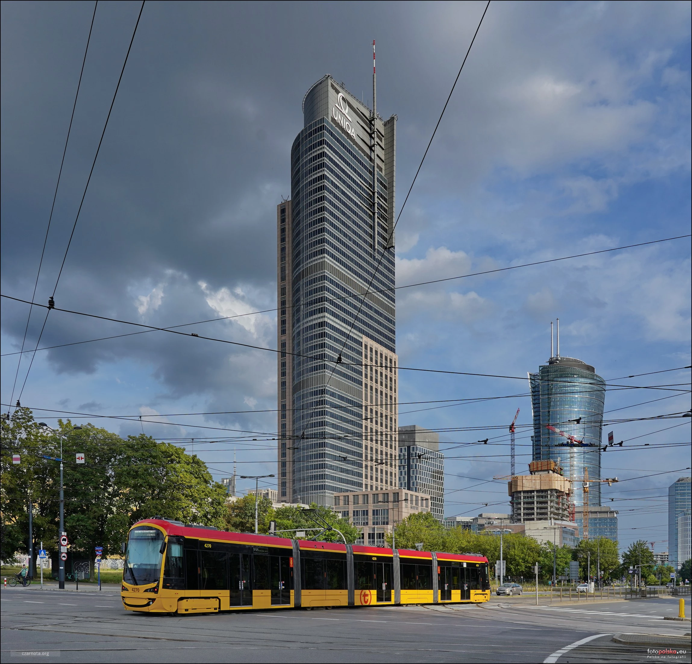 29 lipca 2023 , WTT widziany z Al. Solidarności. Tramwaj Hundai. W tle budowa The Bridge.Skomentuj zdjęcie