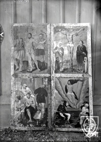 Lata 1900-1905 , Skrzydło tryptyku. Kościół parafialny Narodzenia NMP w Racławicach pochodzi z roku 1511. Uznawany za świątynię późnogotycką bez większych zmian dotrwał do naszych czasów. Jedynie w czasie remontu na przełomie XVII i XVIII wieku dobudowano wieżę.Skomentuj zdjęcie |