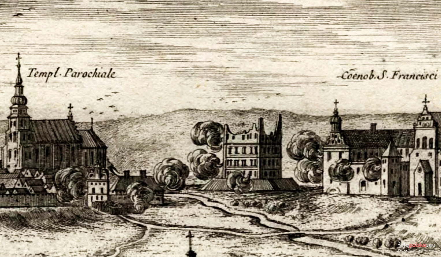 1657 , Płonące ruiny wieży zamkowej. Sztych według rysunku Dahlbergha. Po lewej stronie fara św. Jakuba. Po prawej zespół klasztorny franciszkanów.Skomentuj zdjęcie |