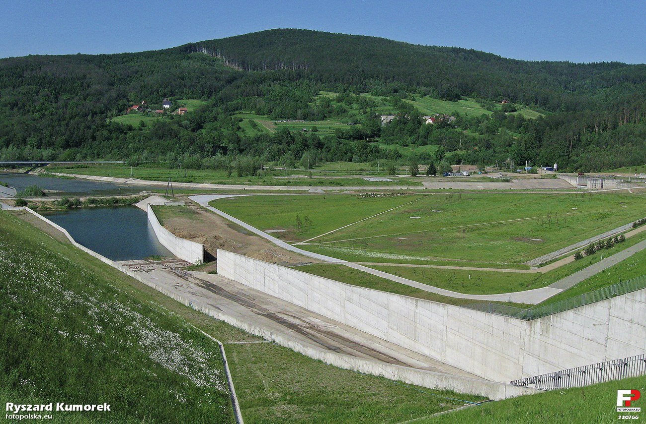 29 maja 2011 , Budowa zapory wodnej w Świnnej Porębie. Rzut okiem na wylot kanału przelewu powierzchniowego i podnóże zapory. Bliżej prawej krawędzi widać betonowy wylot ze sztolni-tędy teraz wypływa Skawa. Natomiast odpływ kanału przelewowego jest jeszcze przegrodzony nasypem ziemnym-to zapewne dla wygodnej przeprawy pojazdów budowy,które w innym razie musiałyby nadkładać drogi i korzystać z mostu widocznego w głębi.Także mały fragment ścianki kanału jest nieskończony-prawdopodobnie dla tego samego celu.Skomentuj zdjęcie |