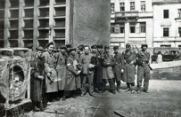 1944 , Oddział powstańców z jeńcem niemieckim przy gmachu Centrali PKO, w głębi zabudowa ulicy Świętokrzyskiej.Skomentuj zdjęcie