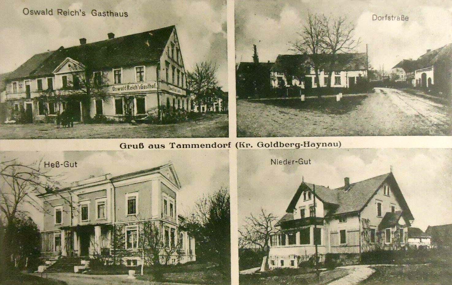 1925 , Na górnych zdjęciach gospoda Oswalda Reicha i droga przez wieś, na dolnych dworek w majątku "Heß-Gut" i dom mieszkalny w majątku "Nieder-Gut"Skomentuj zdjęcie