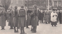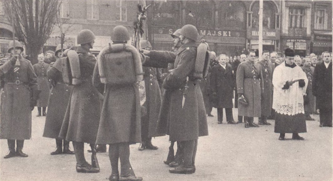 29 listopada 1937 , Dwóch podchorążych w asyście dwóch kolegów składa przysięgę żołnierską na placu Wolności w Poznaniu w imieniu wszystkich na sztandar pułkowy, ozdobiony najwyższymi odznaczeniami bojowymi, polskim Virtuti Militari i rumuńskim Michała Walecznego. Przysięgę odbiera ks. kapelan Paszkiewicz.Skomentuj zdjęcie |