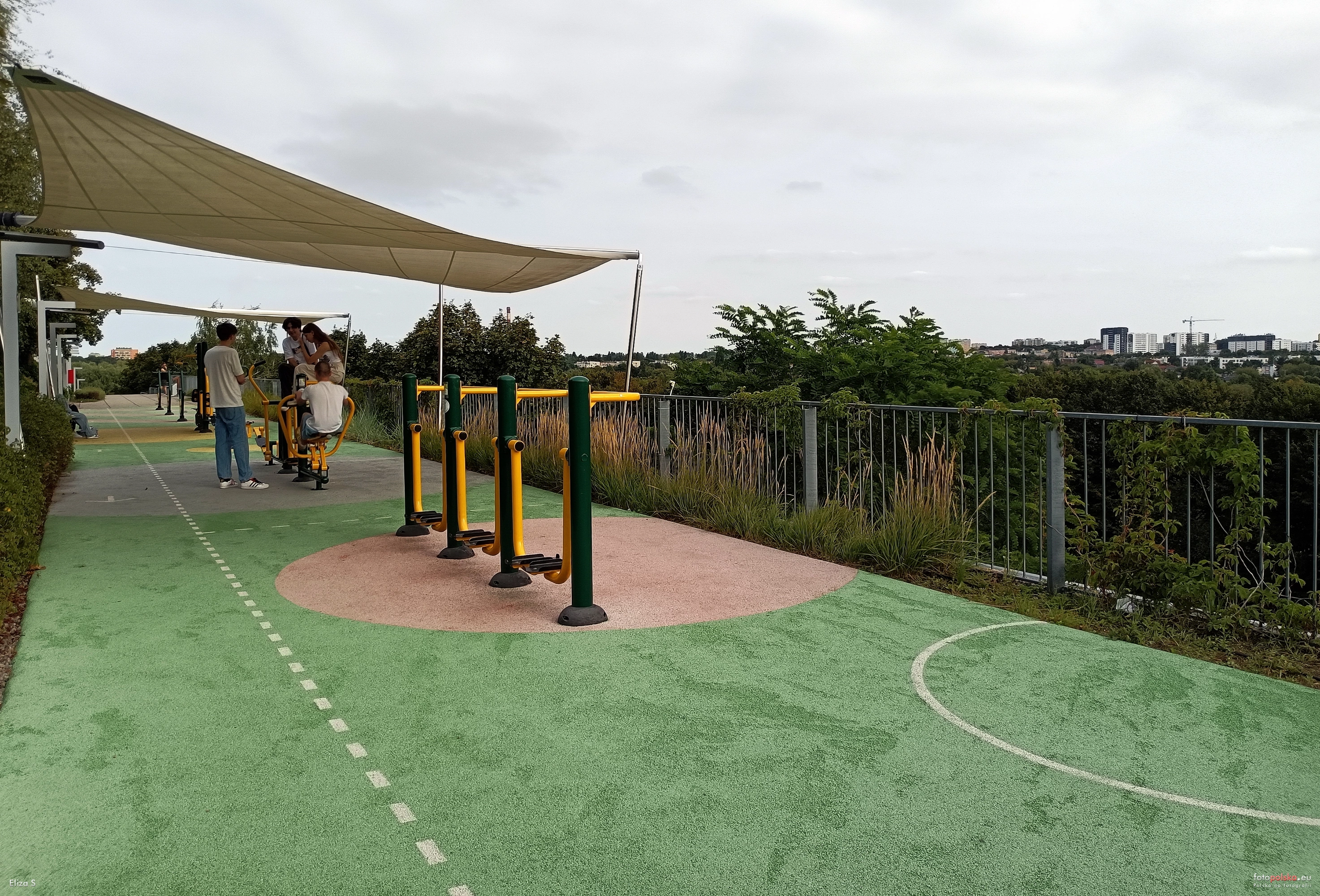 28 sierpnia 2023 , Vivo! Lublin, fragment budynku, siłownia zewnętrzna pod przeciwsłonecznymi żaglami na górnym poziomie od strony rz. Czechówki. W głębi z prawej widoczne Osiedle Słoneczne Ogrody przy ul. Wrońskiej.Skomentuj zdjęcie |