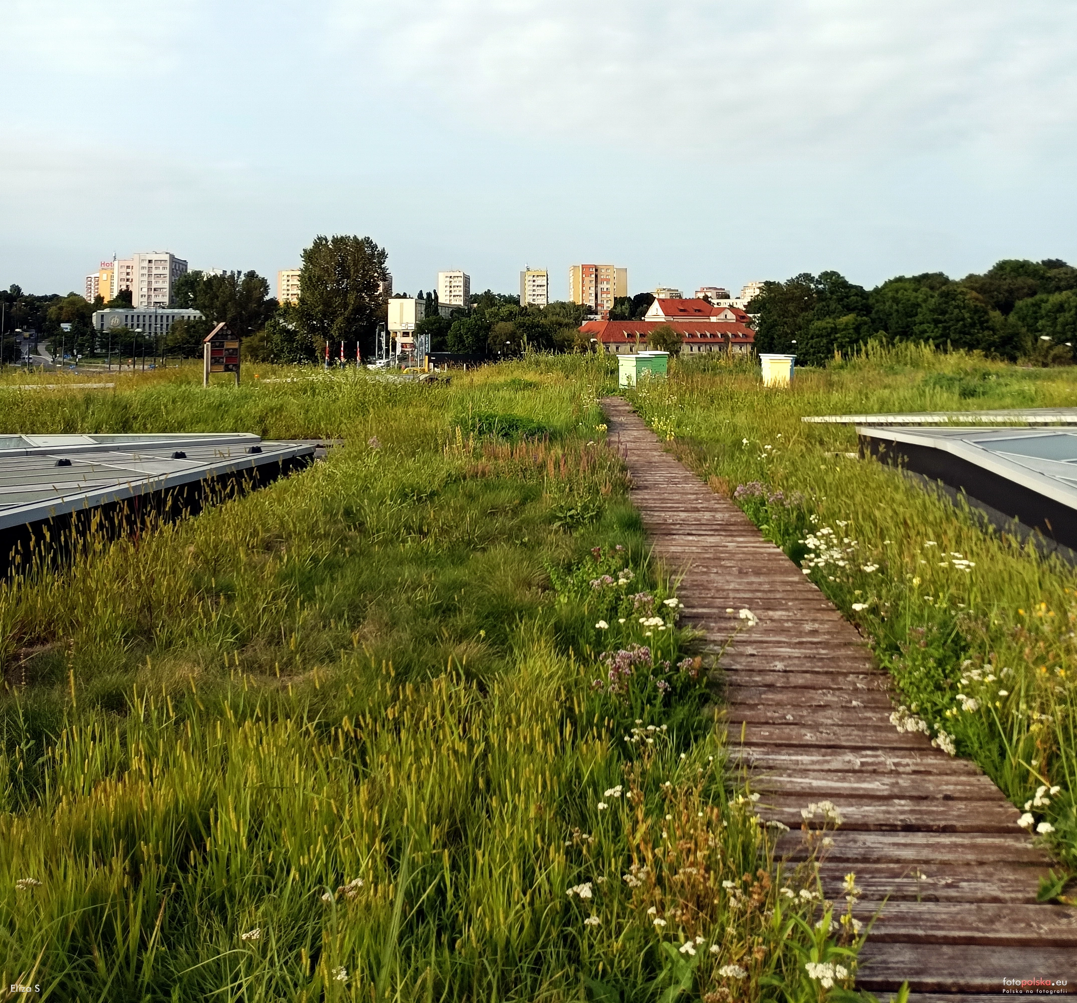 28 sierpnia 2023 , Vivo! Lublin, fragment wyłączonej ogólnodostępnej strefy na dachu budynku. Drewniany podest w kierunku pasieki. Po bokach fragmenty okien dachowych w konstrukcji dachu. Widok w kierunku Dzielnicy Kalinowszczyzna.Skomentuj zdjęcie |